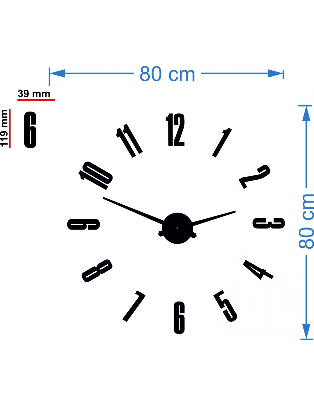 Dimensiuni autocolant: 800 x 800 mm, poate fi mărit până la 1300 x 1300 mm. Dimensiuni mecanism: 100 x 100 mm. Lungime ac: 30 - 40 cm.