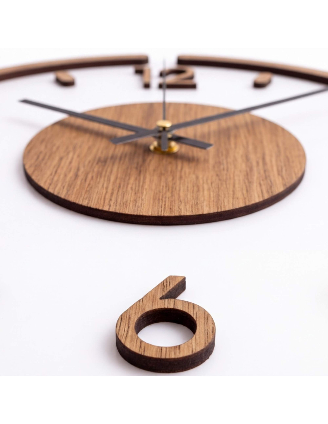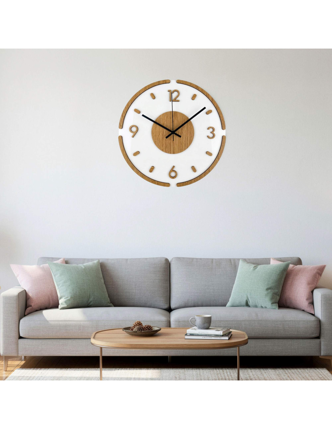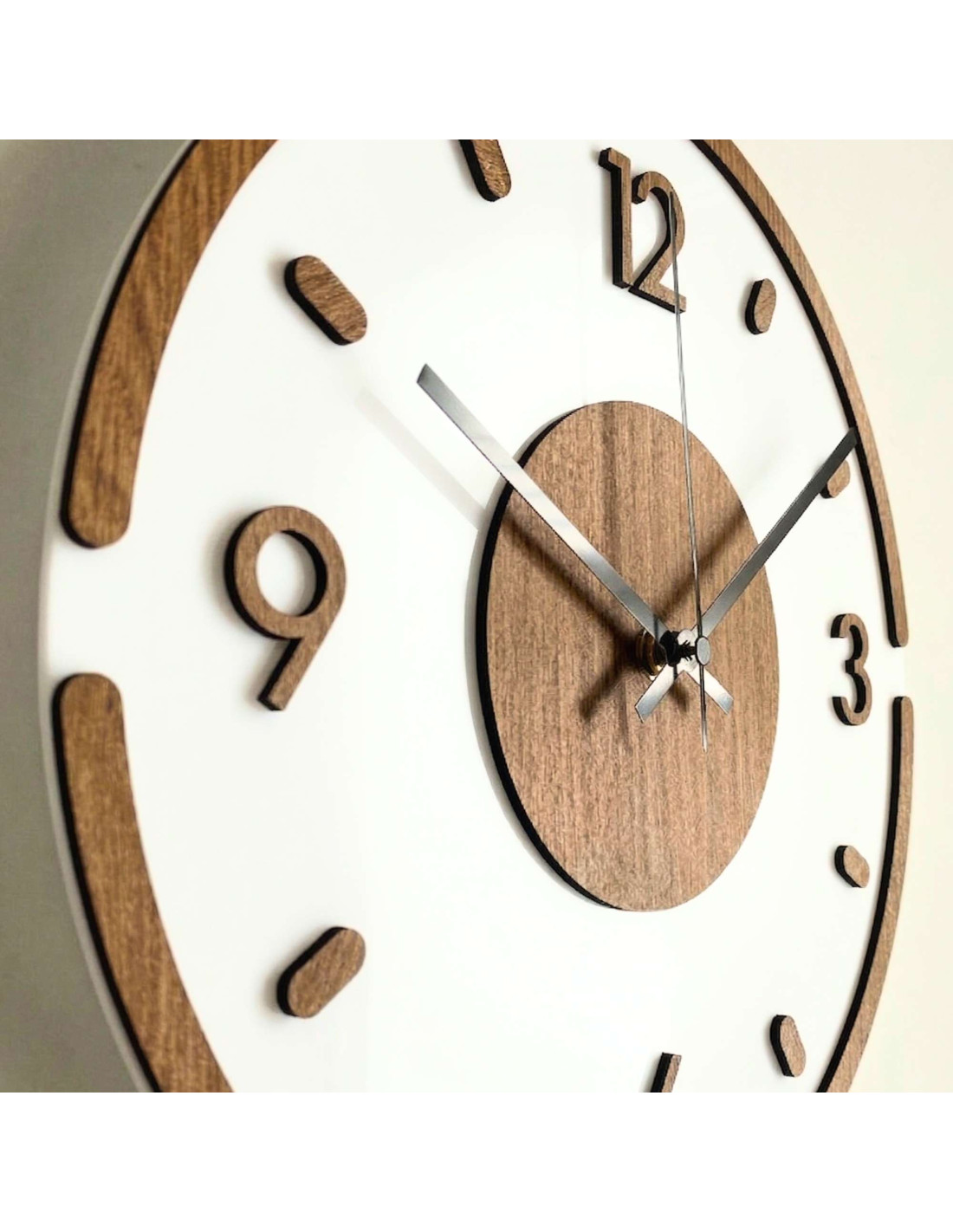 Ceas de perete rotund modern cu decor din stejar și plexiglas alb .