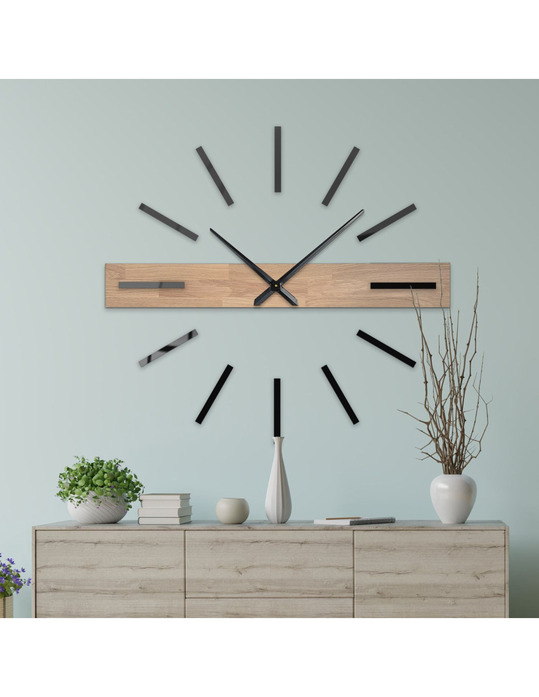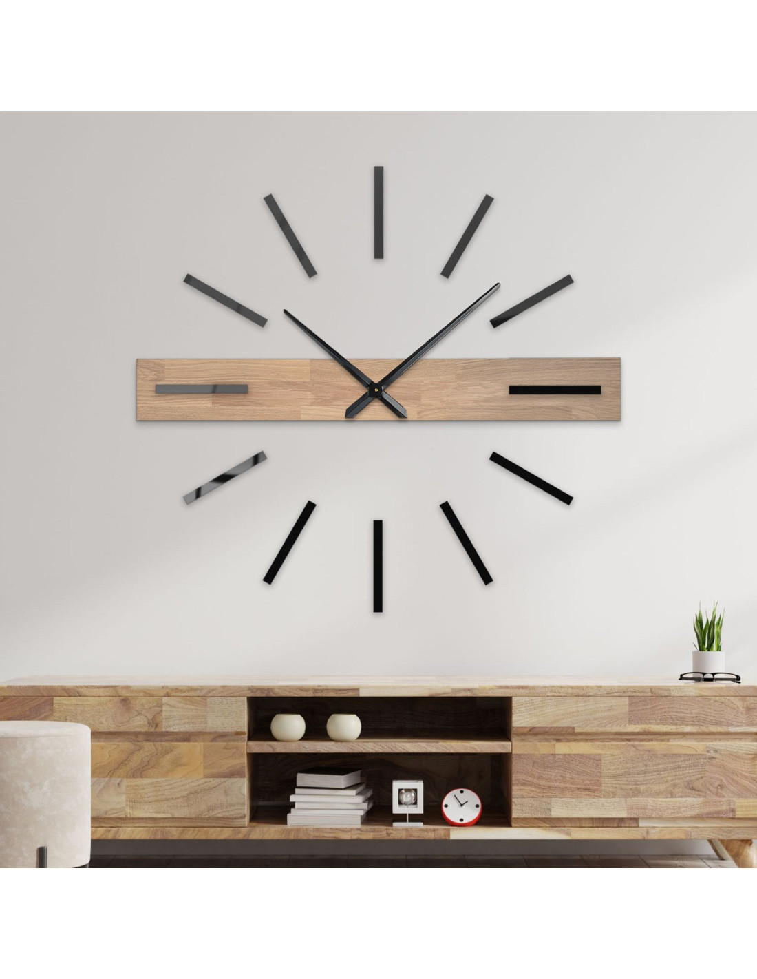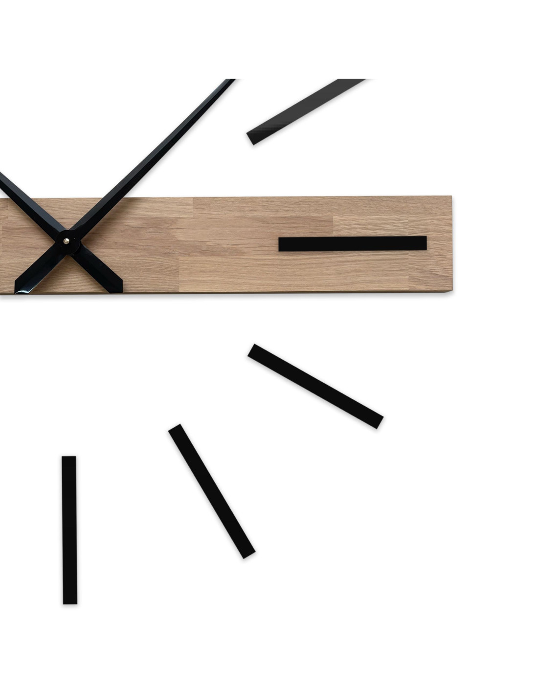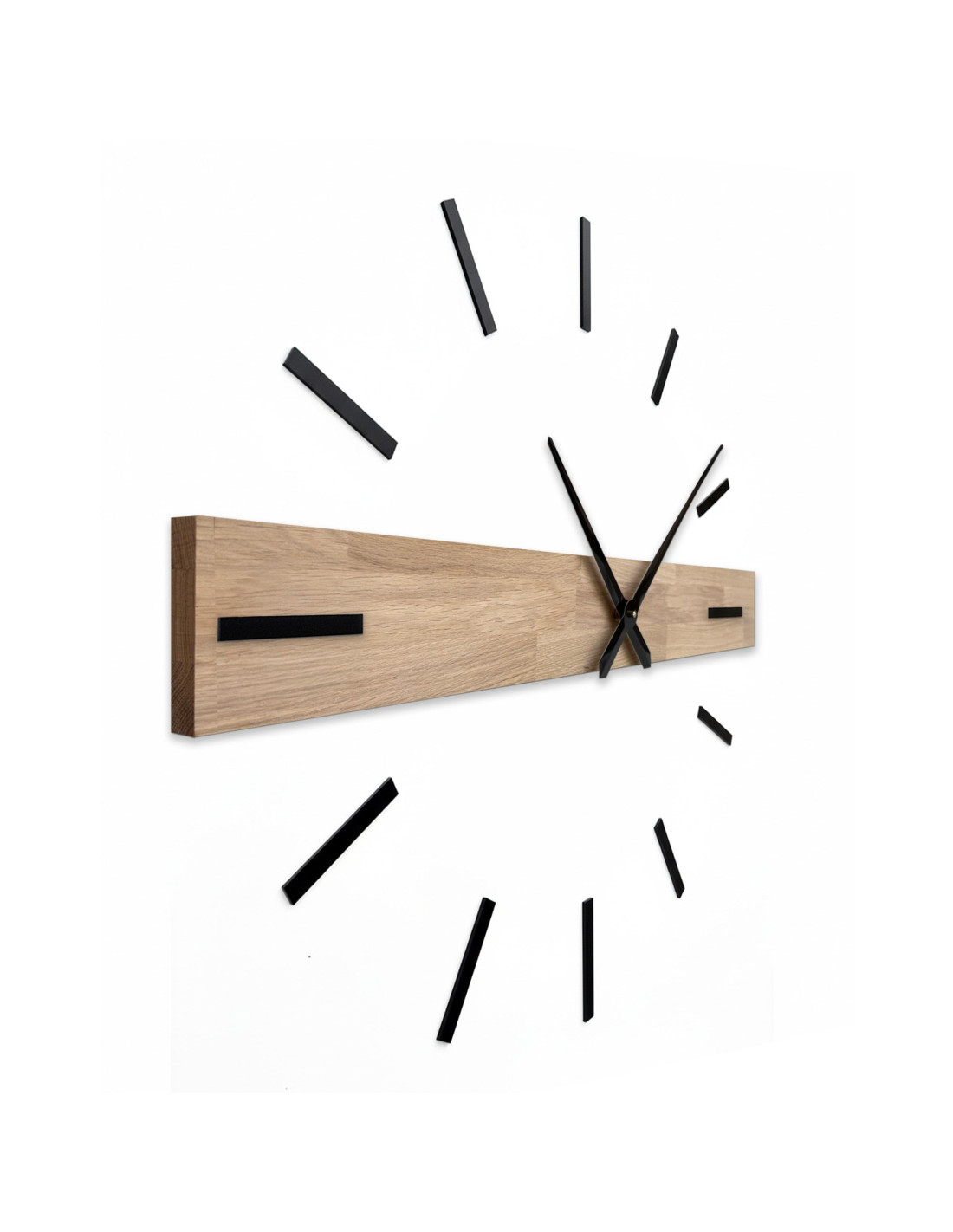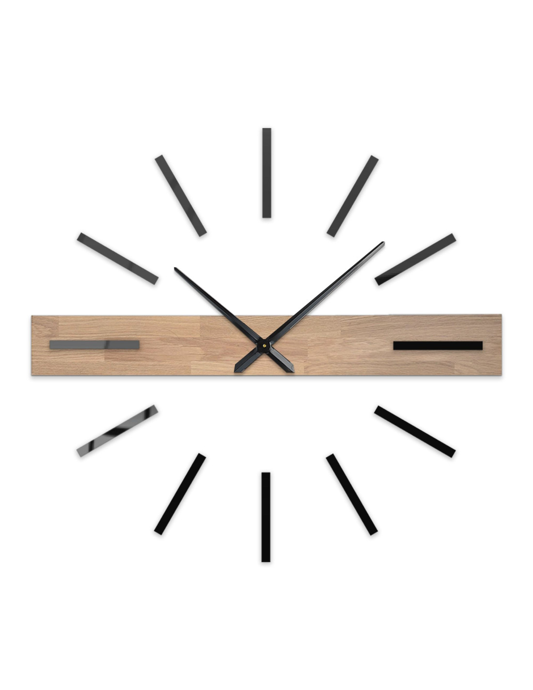 Elementul orizontal dominant, realizat din lemn masiv, creează un accent vizual original, în timp ce indecșii 3D eleganți și acele metalice conferă ceasului un caracter luxos și contemporan.