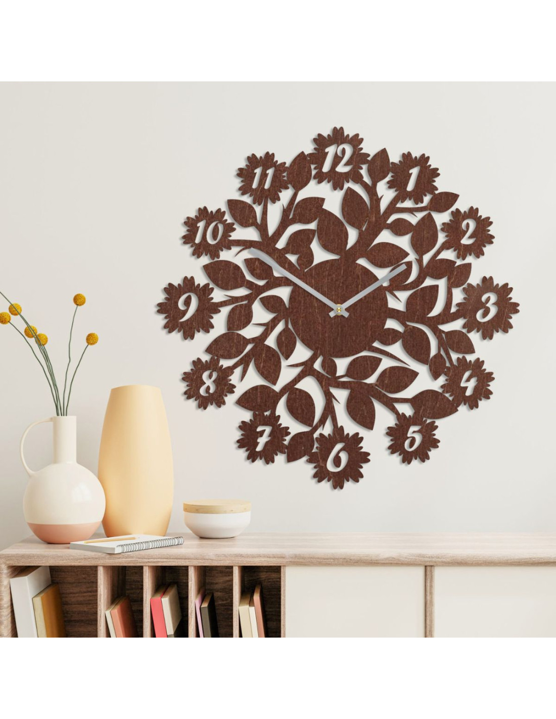 Ceas de perete original din lemn - eleganță naturală cu un design floral delicat