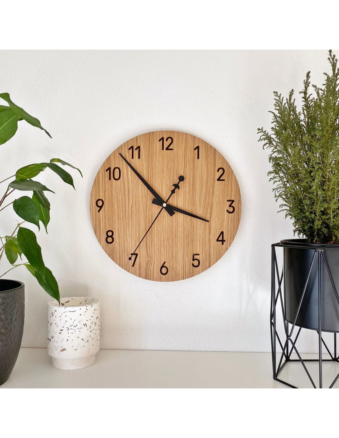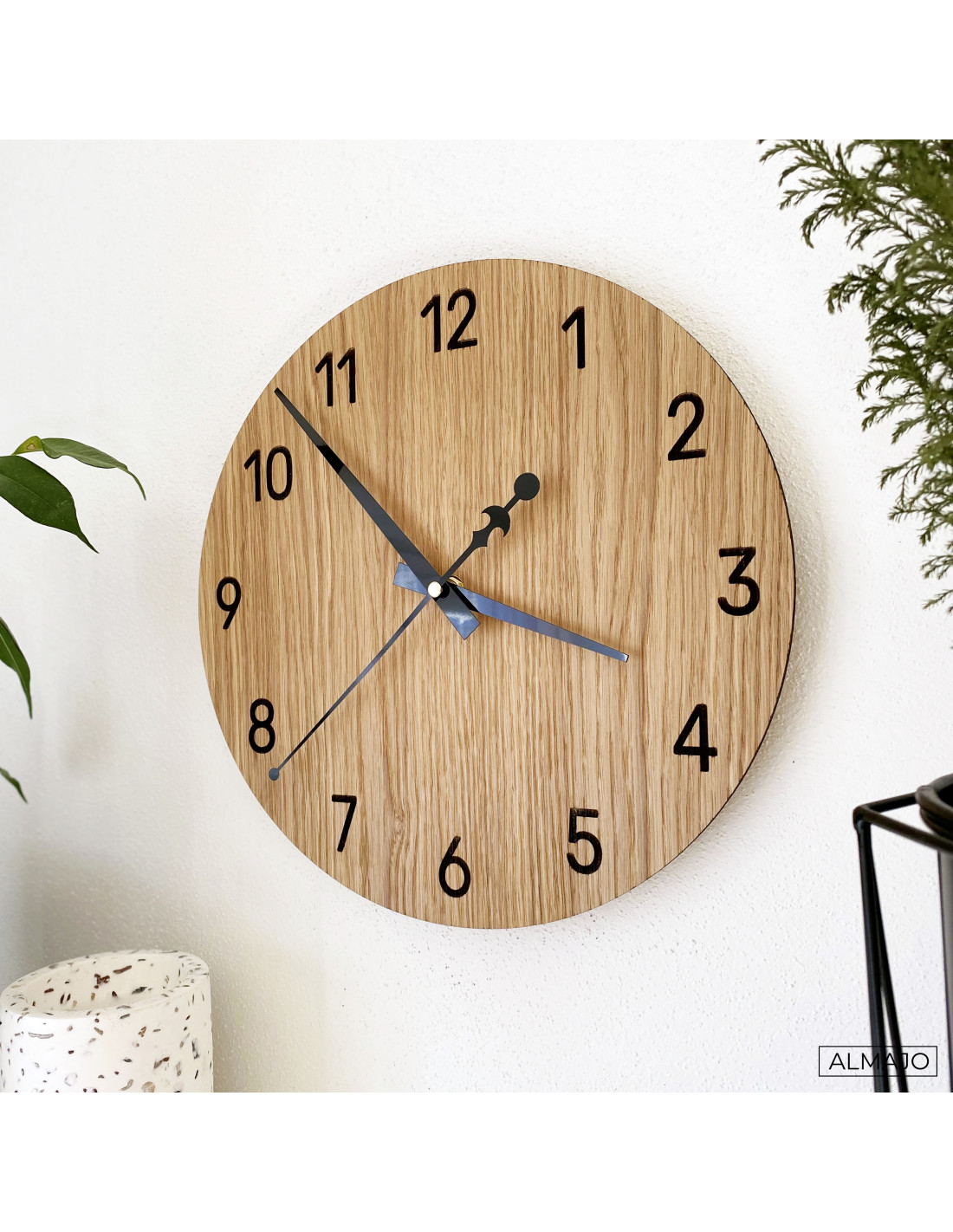 Ceasurile de perete din stejar sunt concepute pentru a se integra armonios în orice interior, de la modern la rustic. Suprafața lor naturală și acele minimaliste adaugă eleganță stilată și echilibru vizual spațiului.