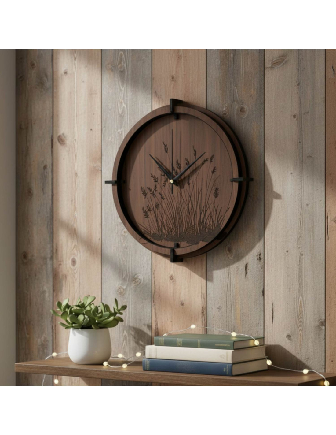Ceas de perete elegant din lemn, cu motiv gravat de iarbă de pajiște, aduce stil, natură și design modern oricărui interior. Perfect pentru spațiile scandinave, minimaliste și rustice.