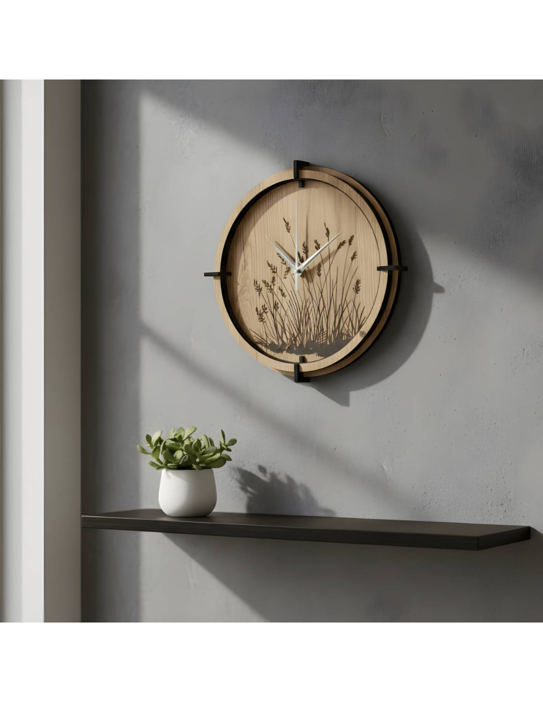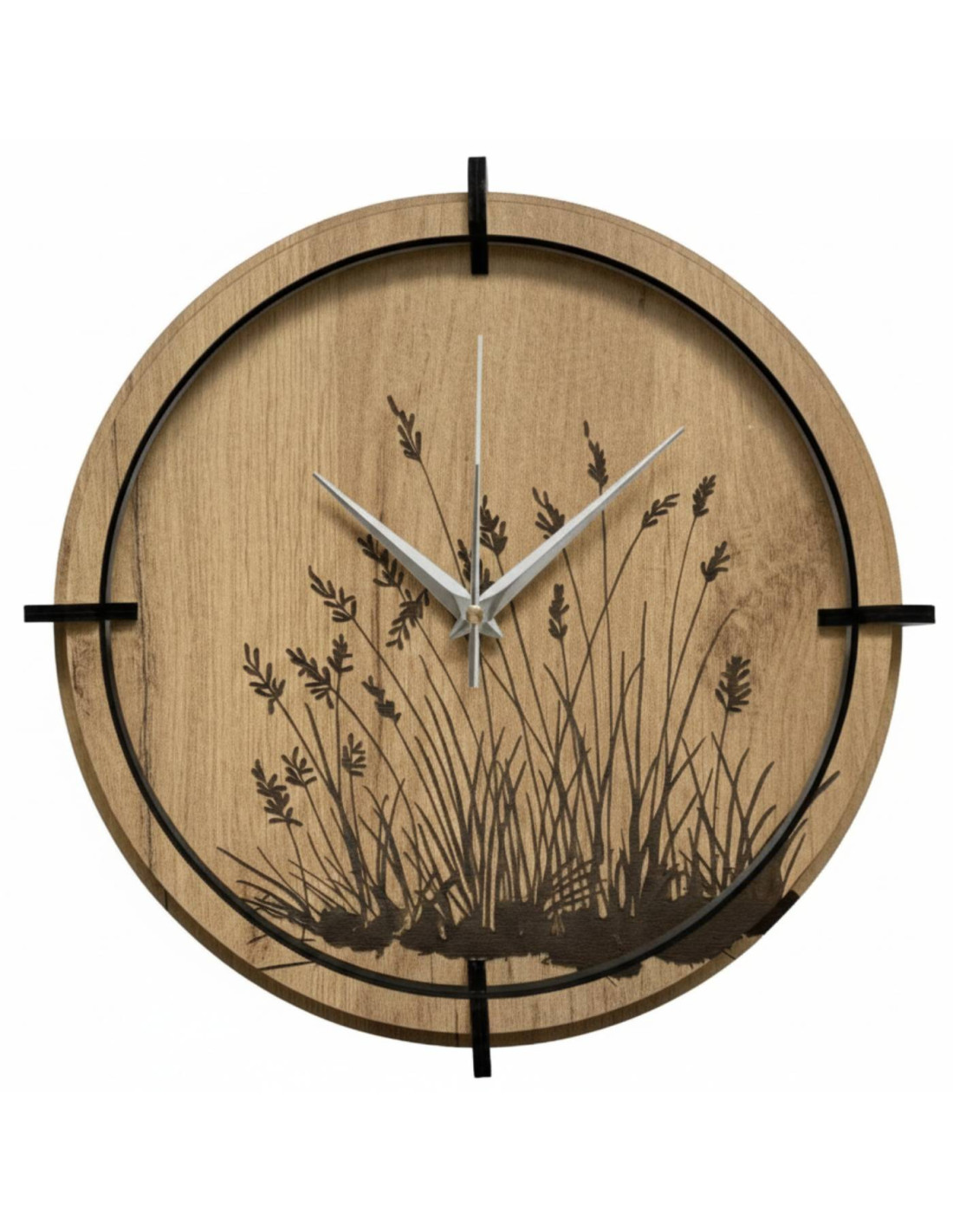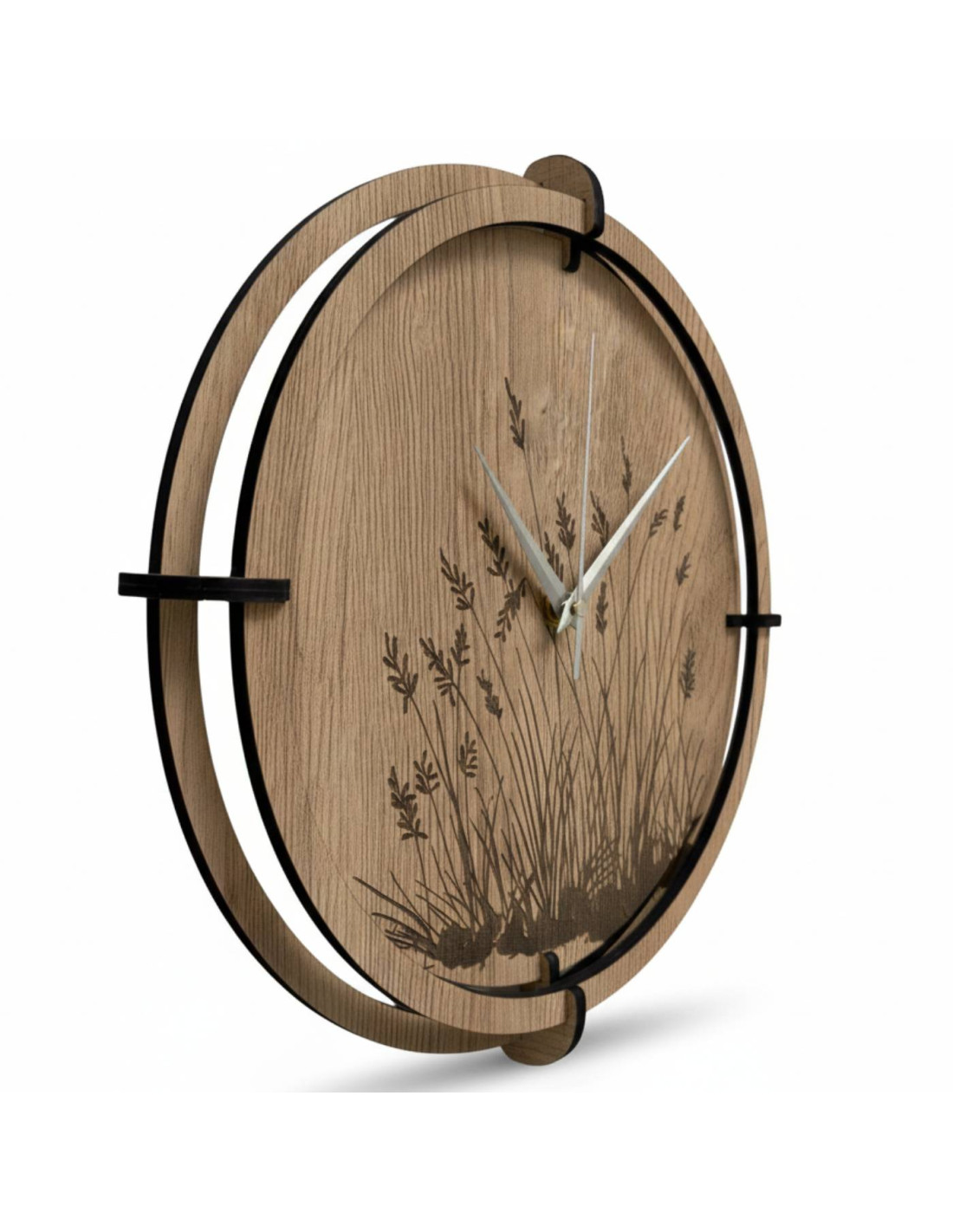 Ceas de perete din lemn cu un motiv elegant de iarbă de pajiște