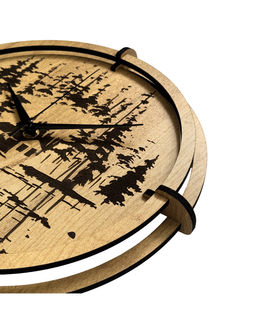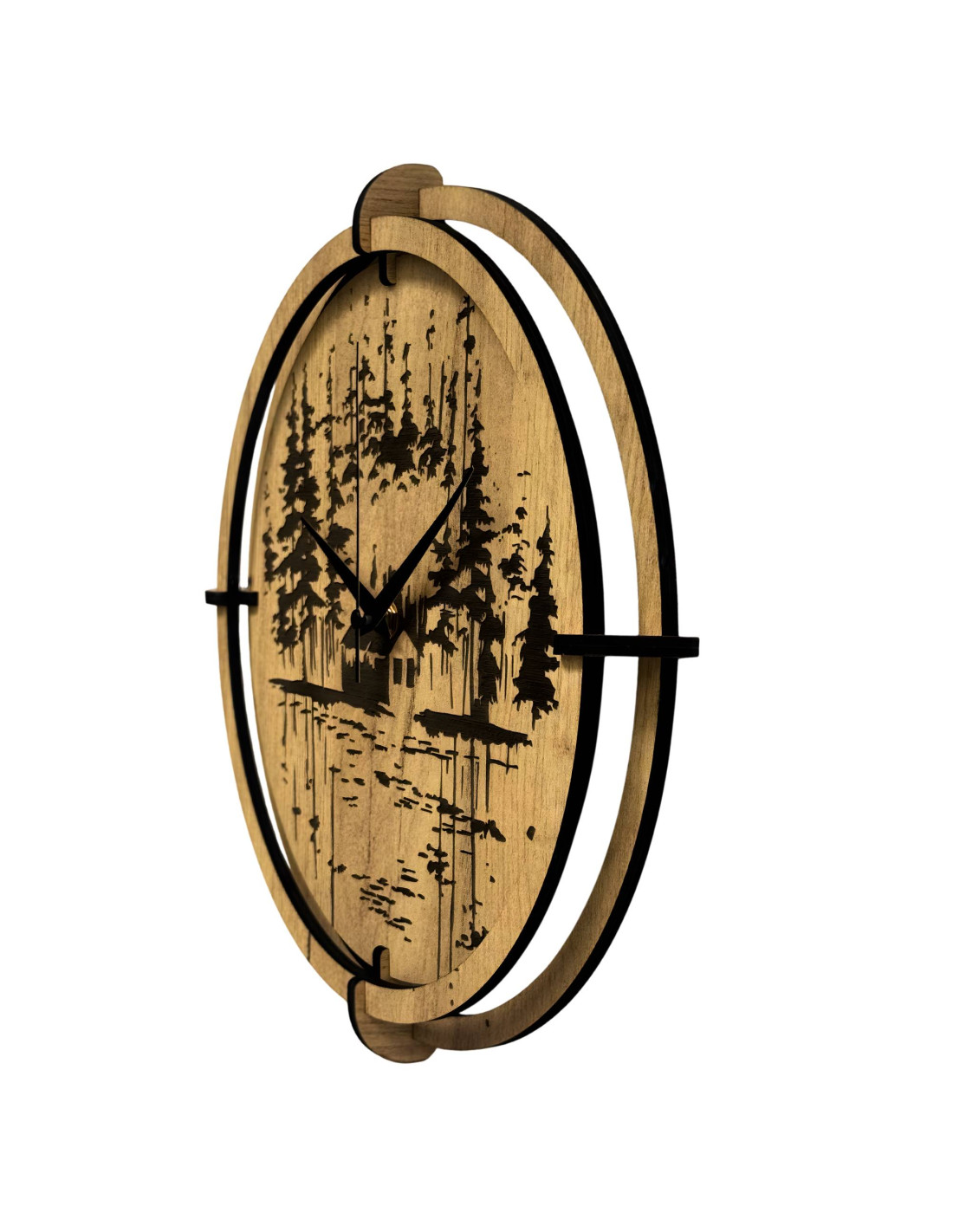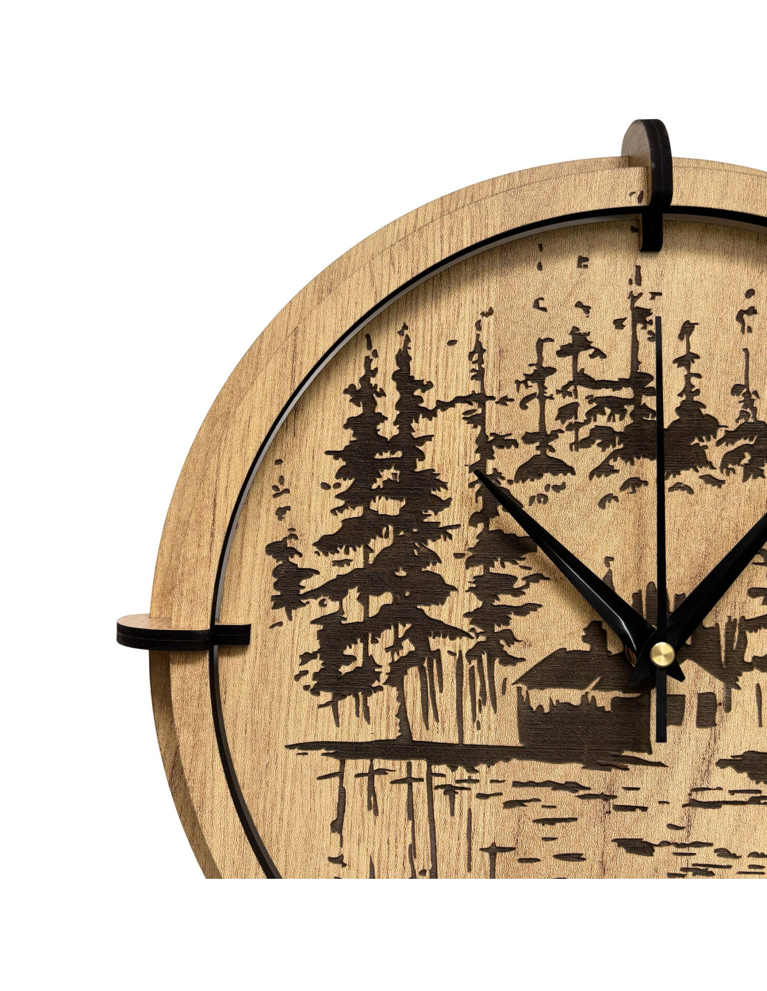 Ceasurile de perete moderne din lemn, cu motivul gravat cu precizie al unei cabane de pădure lângă lac, aduc în interior liniștea naturii și atmosfera unică a pădurii .