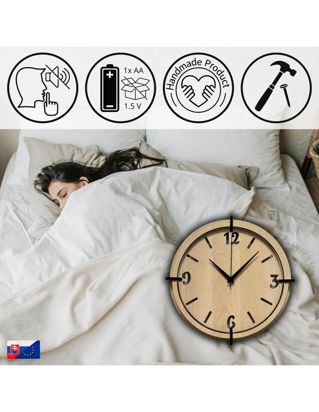 Ceasul este fabricat din placă HDF de înaltă calitate , cu o textură naturală fină a lemnului și o prelucrare precisă multistrat, care creează un efect 3D atractiv.