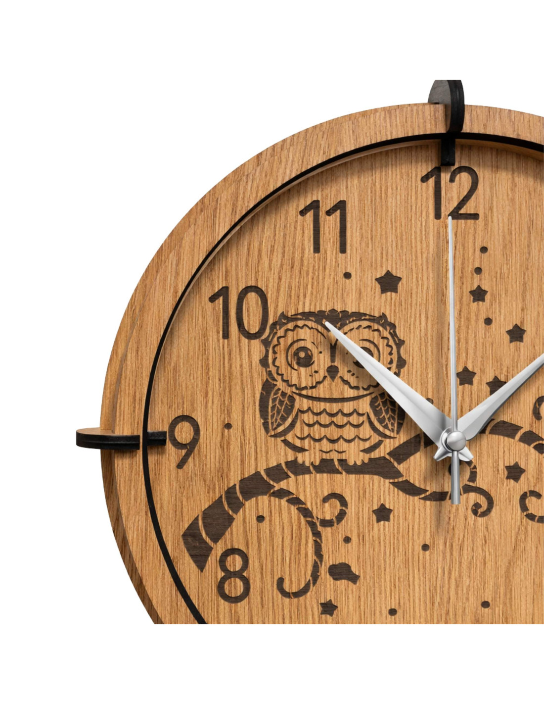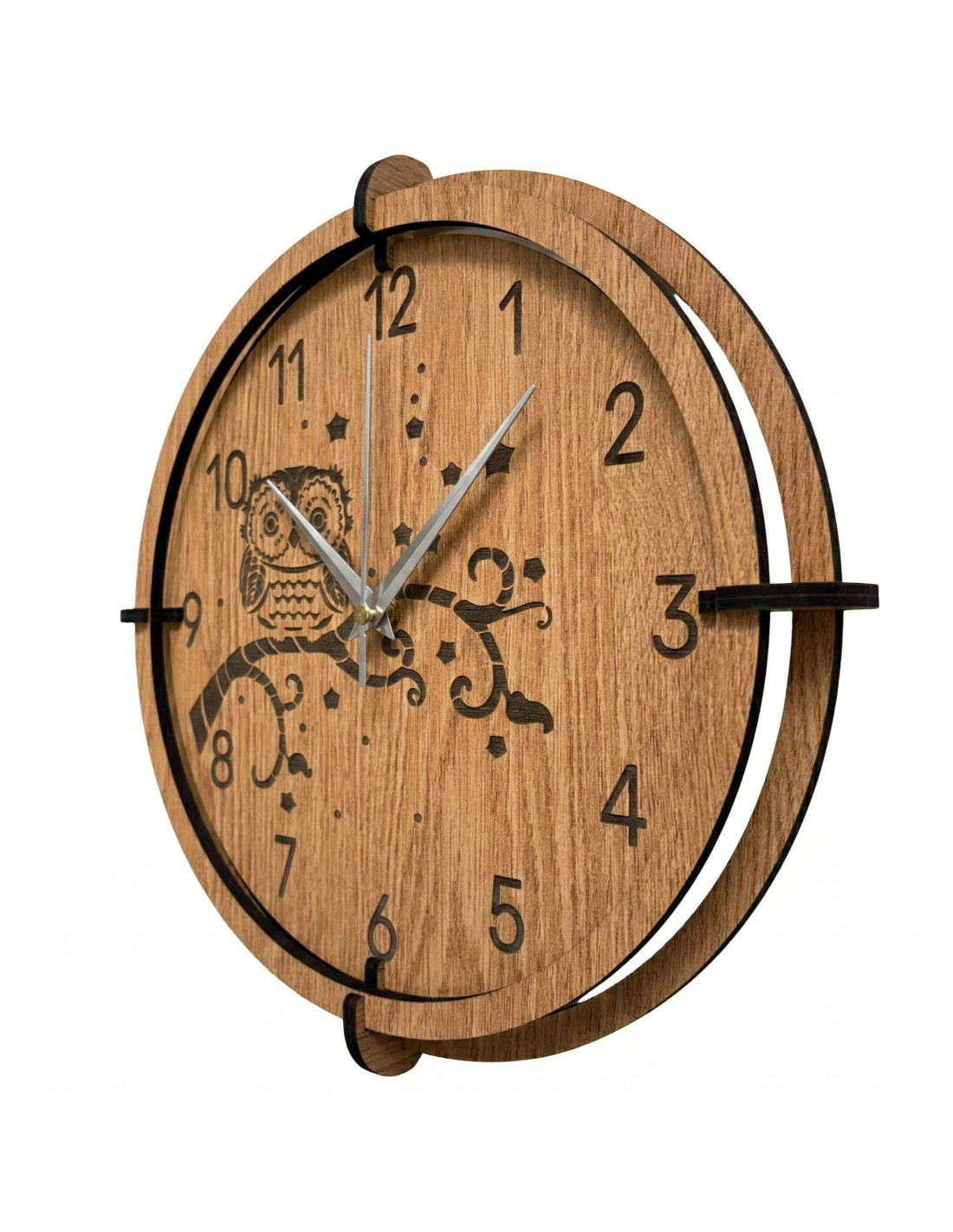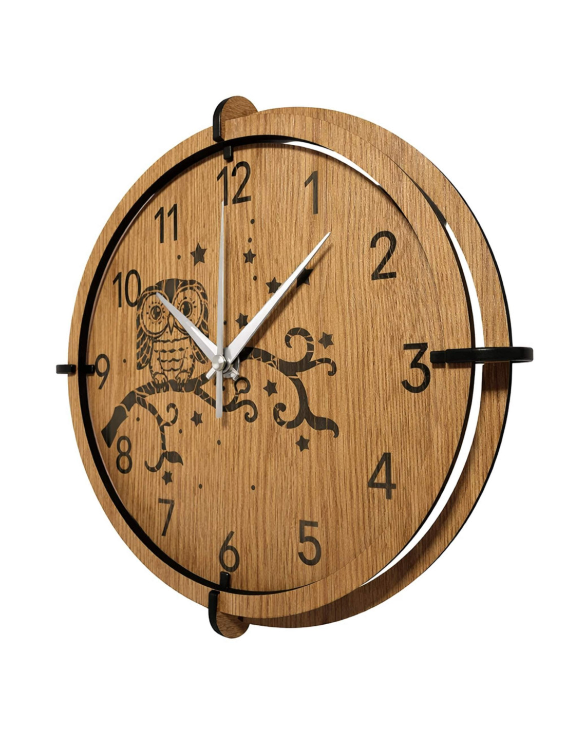 Un ceas de perete modern din lemn , cu un motiv gravat detaliat al unei bufnițe pe o creangă și al cerului nopții, va aduce pace, căldură de acasă și un accent natural subtil interiorului.