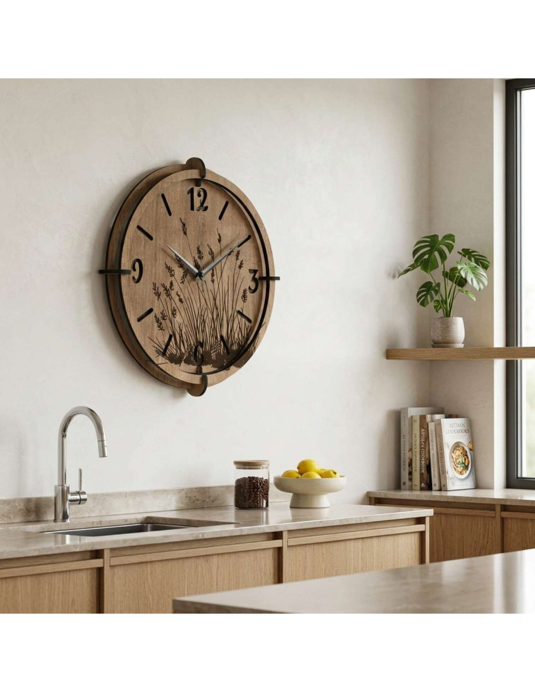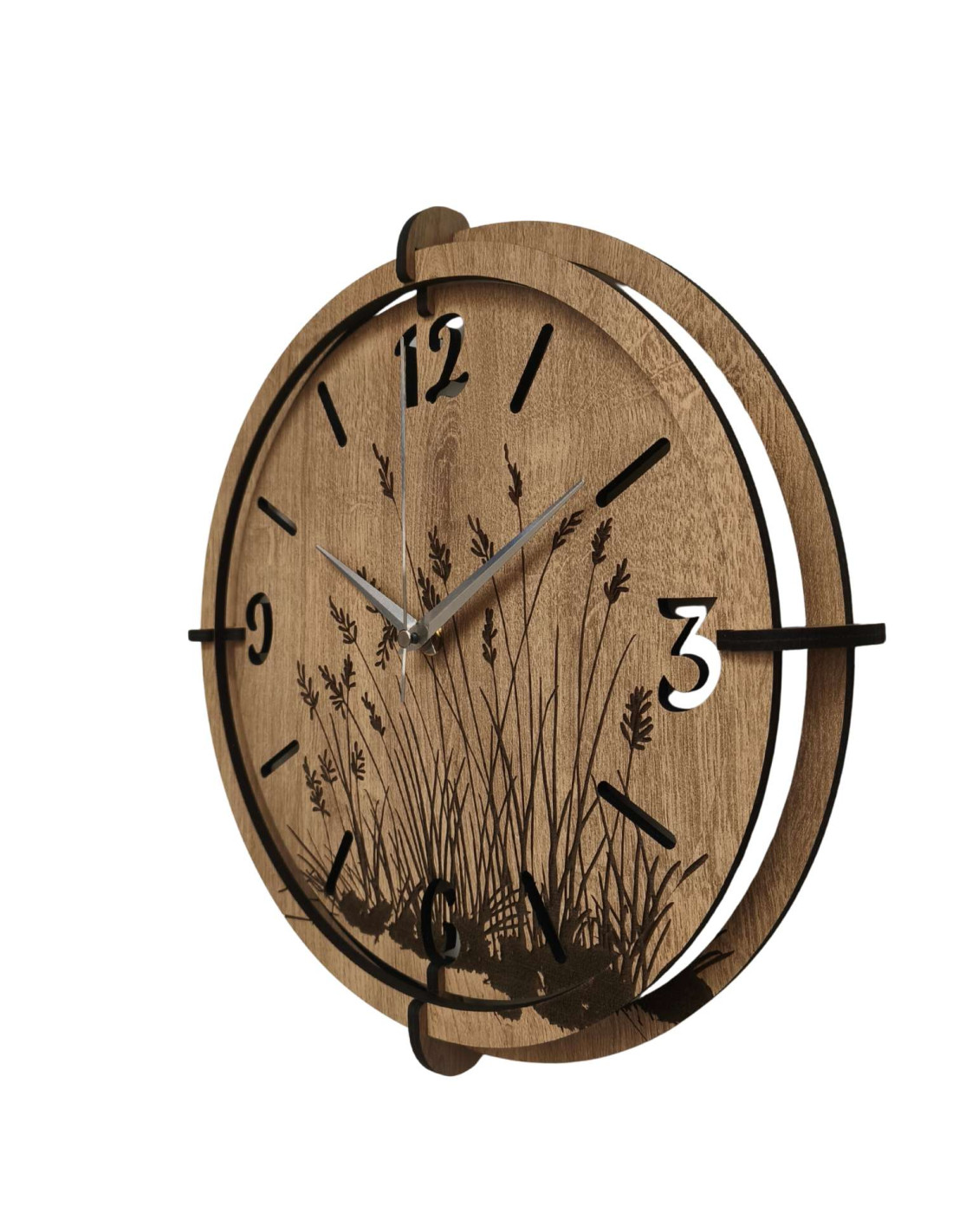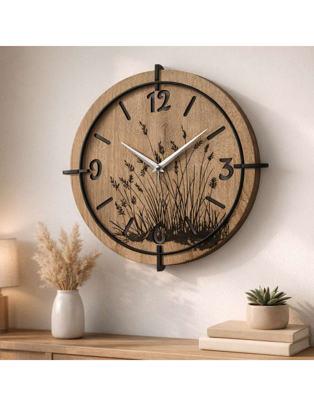 Ceasurile de perete moderne din lemn , cu un motiv gravat delicat de ierburi de pajiște, aduc pace și armonie în interior.