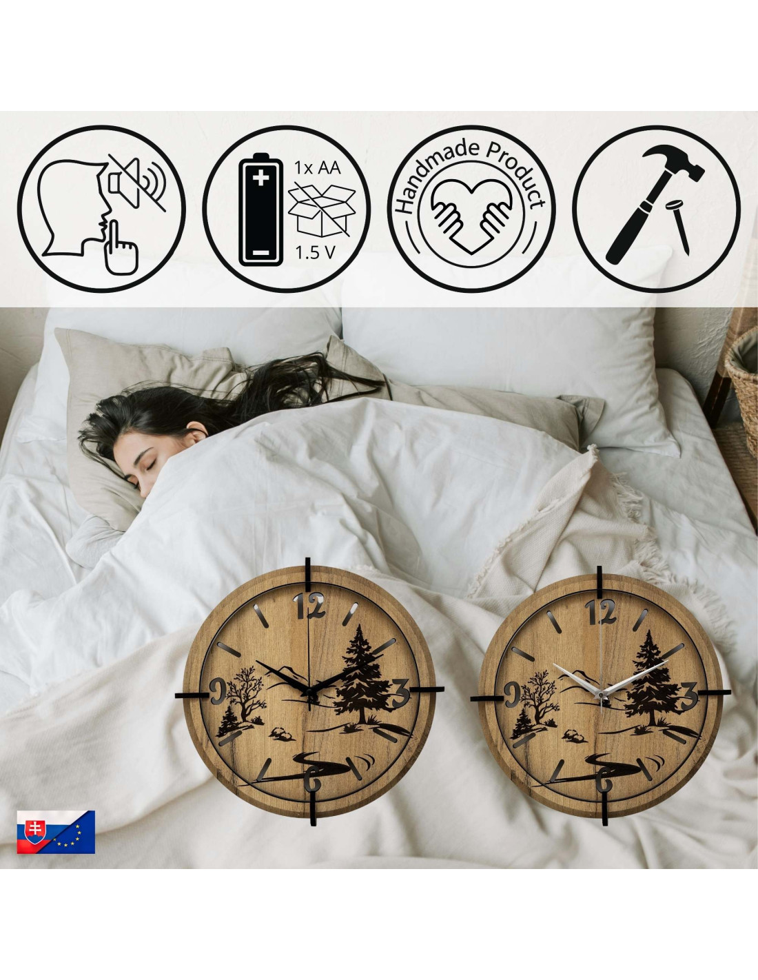 Ceasurile din lemn cu gravură precisă a peisajelor combină aspectul autentic al naturii cu designul modern , elemente negre contrastante și un mecanism silențios și fiabil.