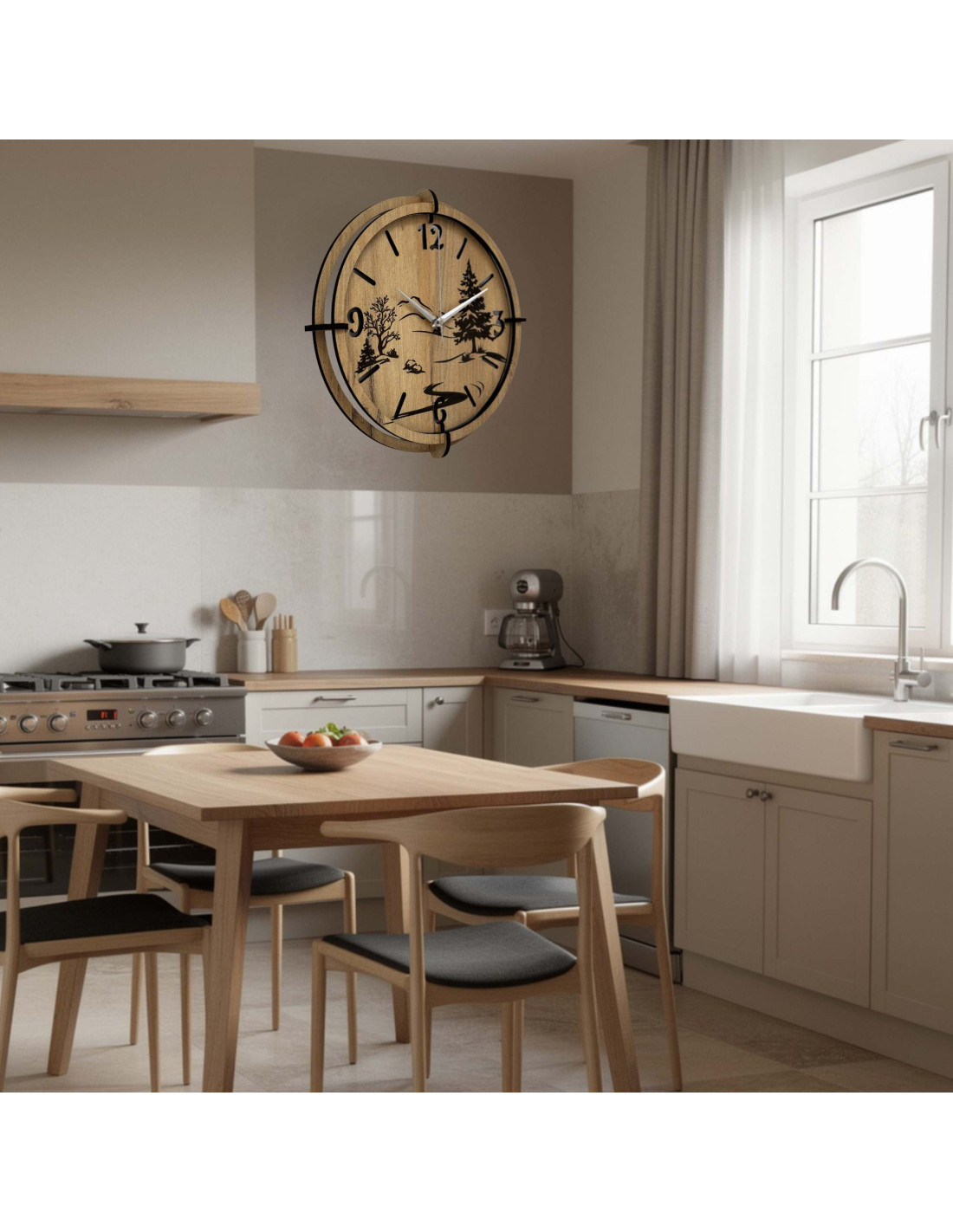 Acest ceas de perete realizat din lemn HDF combină materialul modern cu măiestria autentică.