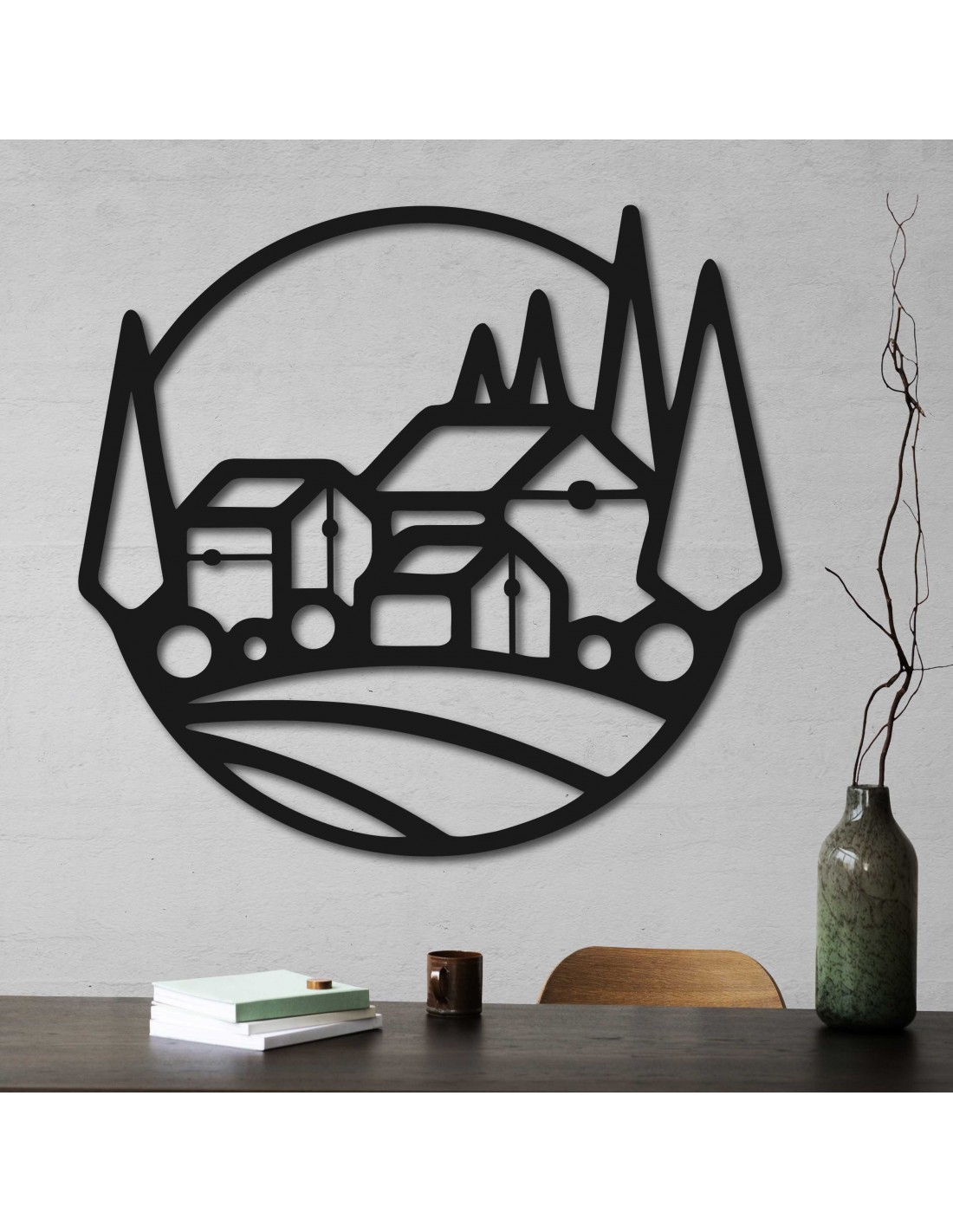 Tabloul din placaj de lemn este în primul rând plăcut din punct de vedere estetic și funcțional. Este creat prin tăiere cu laser, care asigură detalii precise și contraste profunde. Designul surprinde o imagine a unui peisaj tipic, cu case și copaci înalți, evocând un sentiment de pace și armonie cu natura. Este ideal ca decor pentru camere de zi, dormitoare sau birouri, oferind interiorului un caracter unic și un aspect cald. Materialul placaj garantează durabilitate și întreținere ușoară.