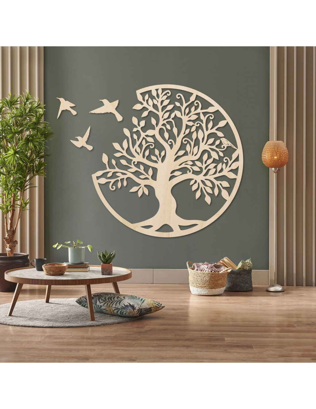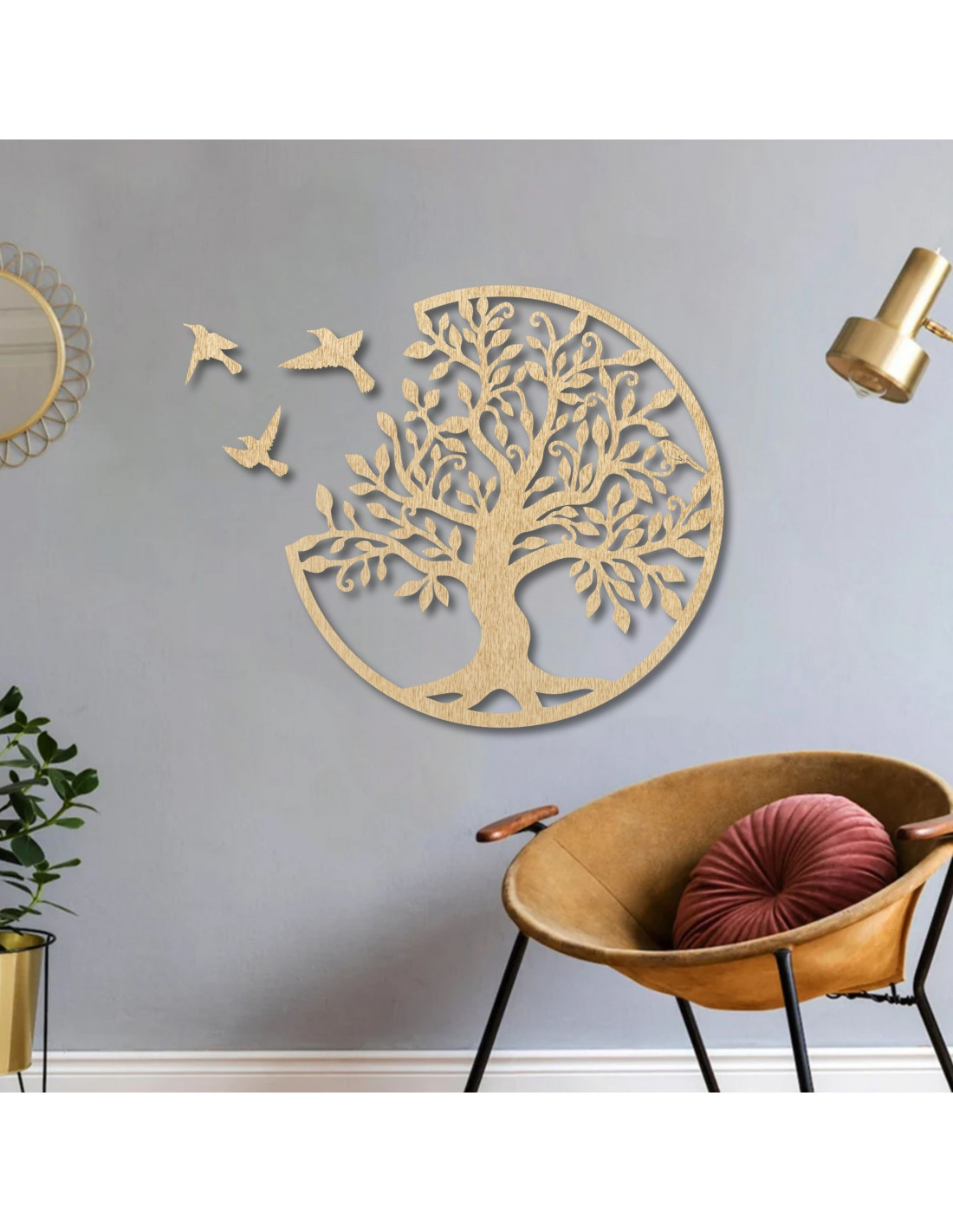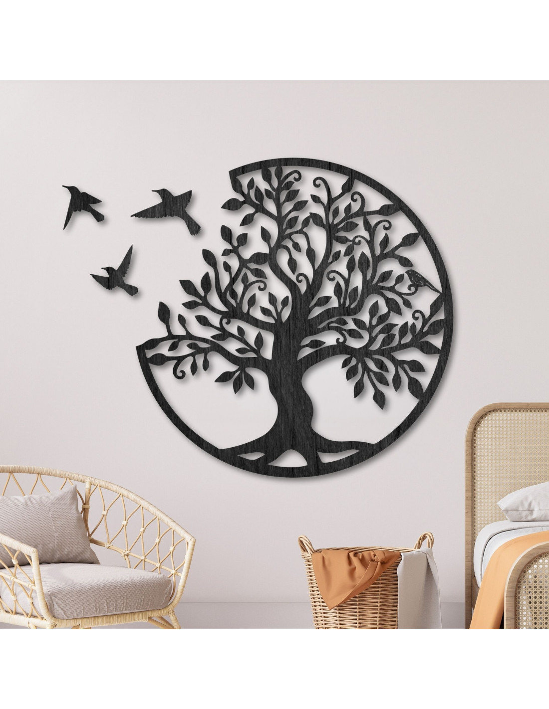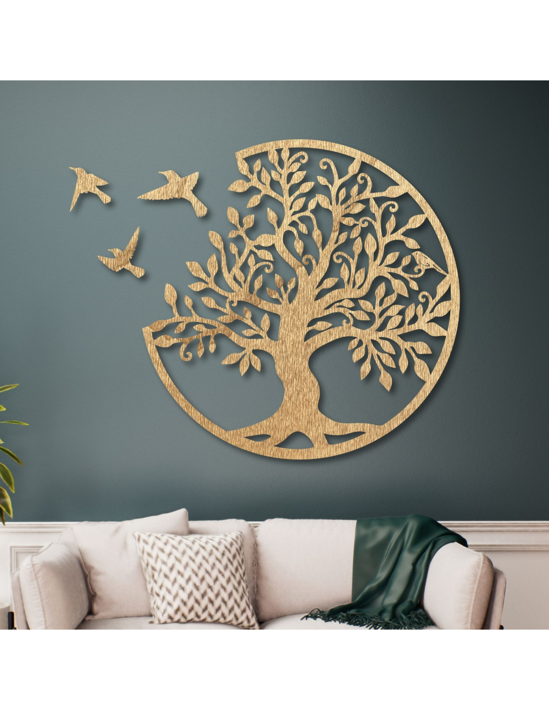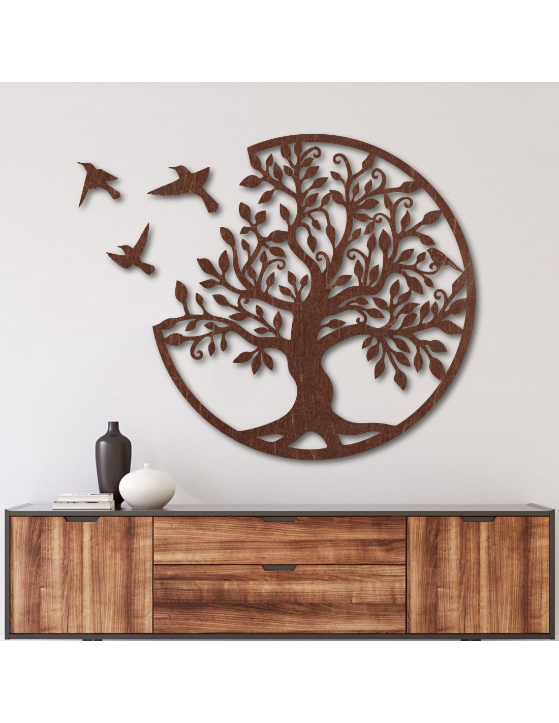 Decorațiune murală din lemn - Pomul vieții cu trei păsări în zbor