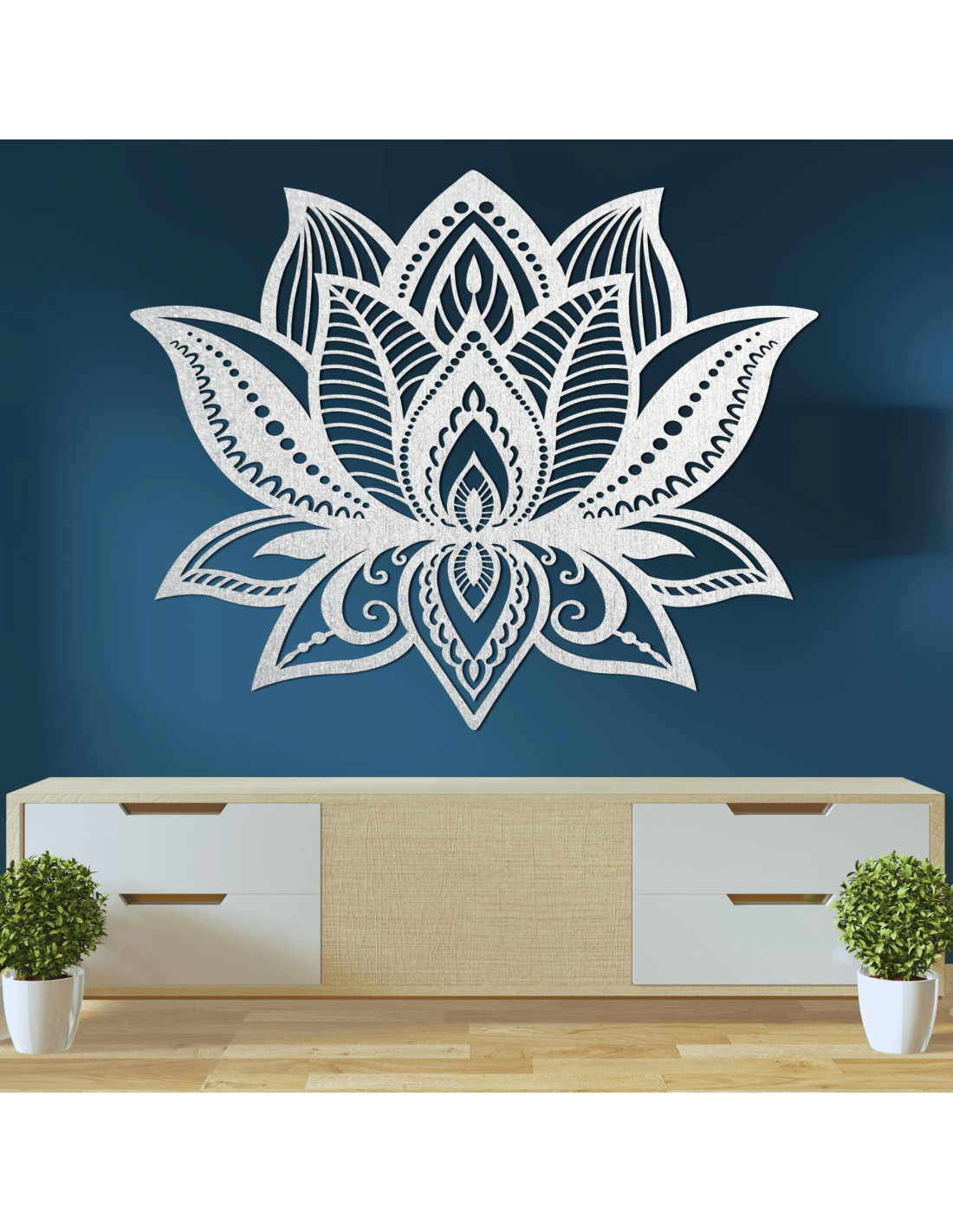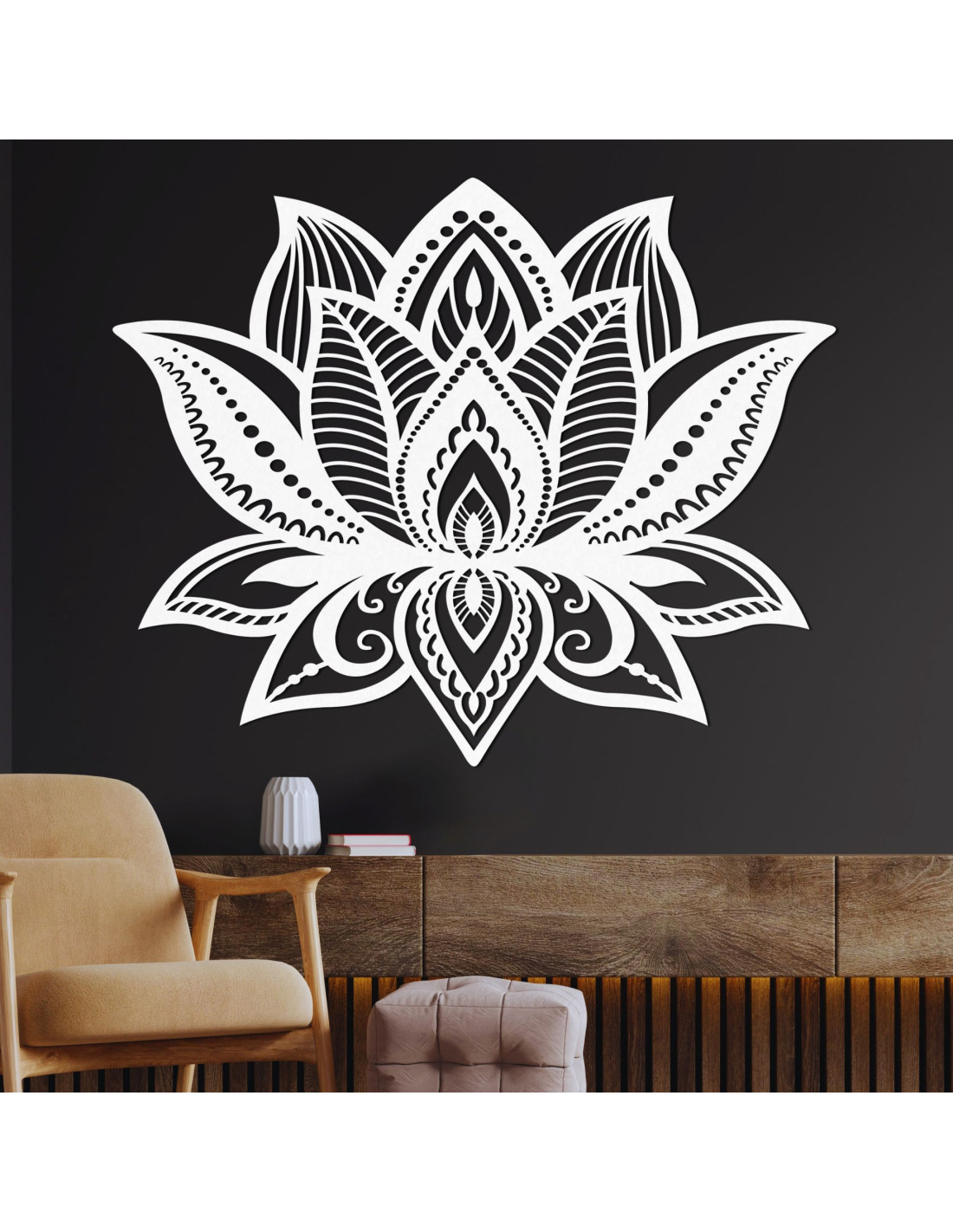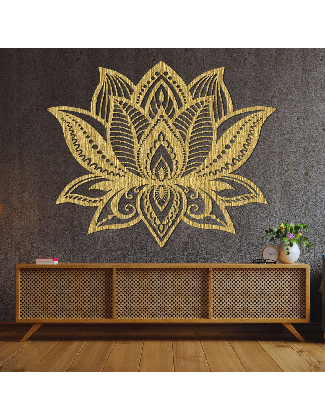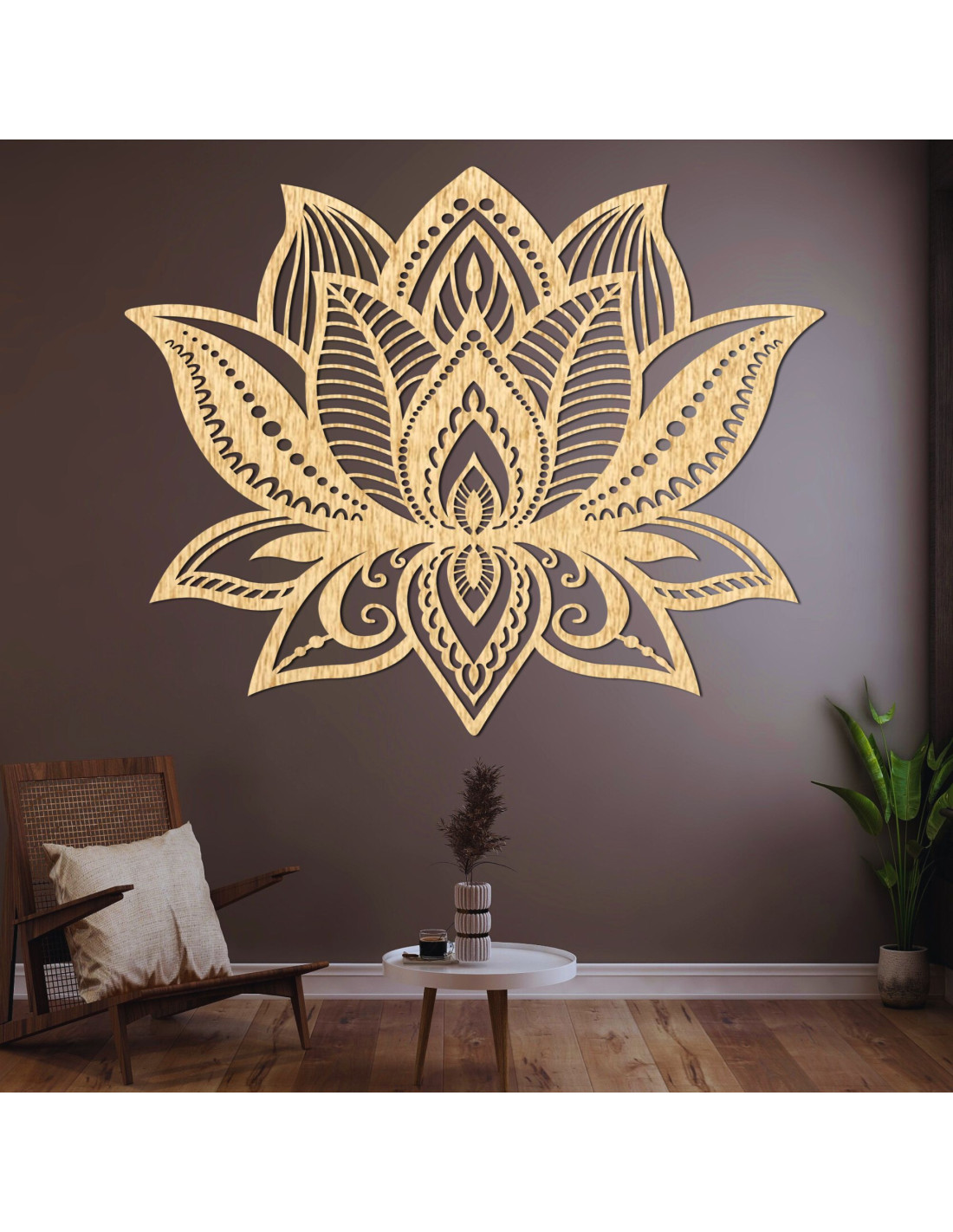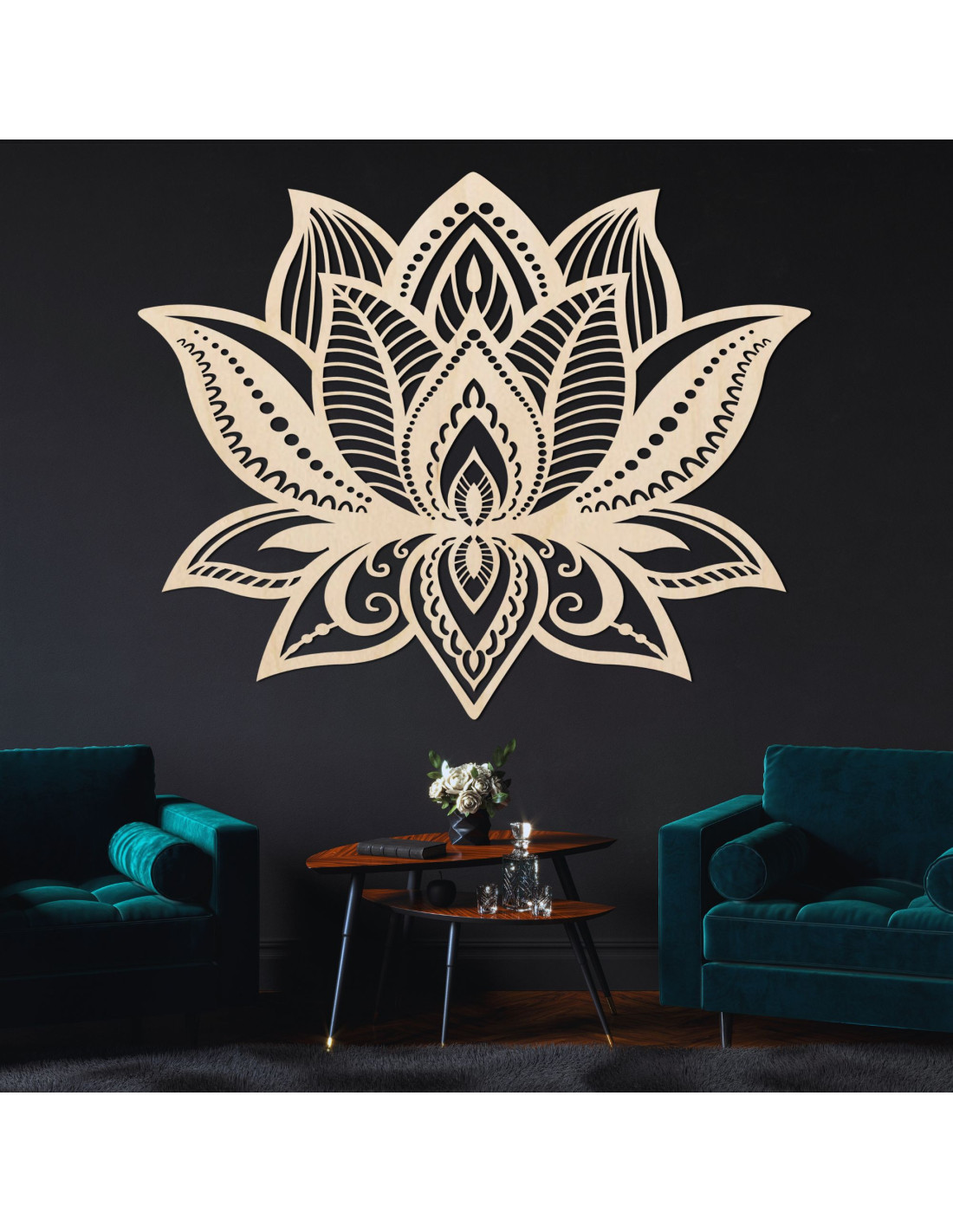 Simetria florii de lotus simbolizează un nou început, puritatea și puterea interioară, în timp ce detaliile sculptate meticulos aduc o textură unică și o notă caldă de lemn în orice cameră.