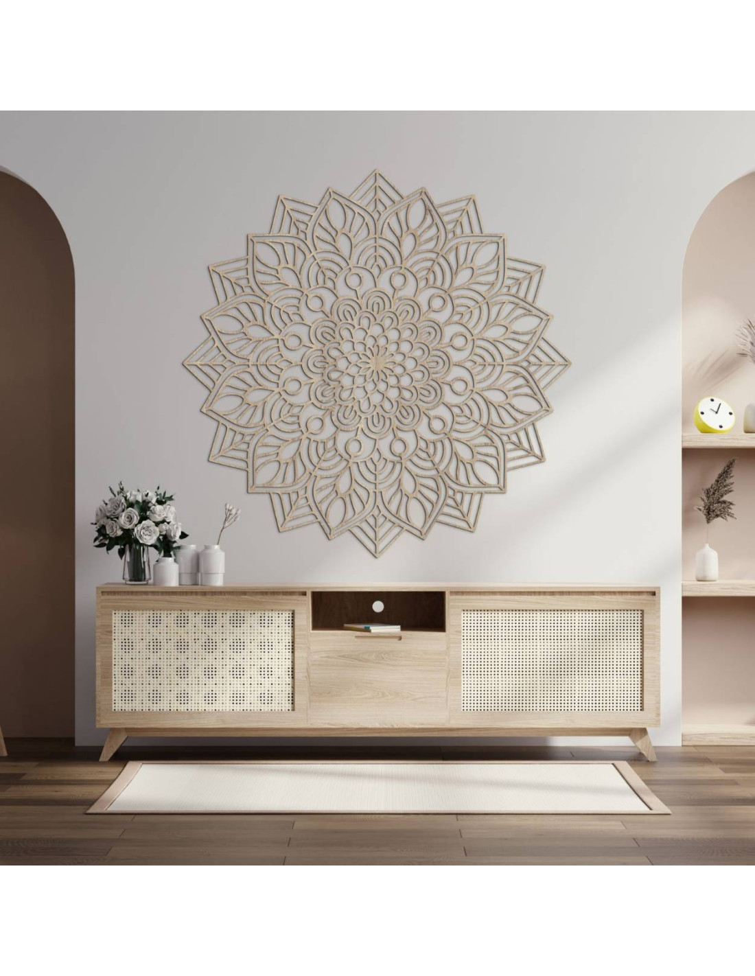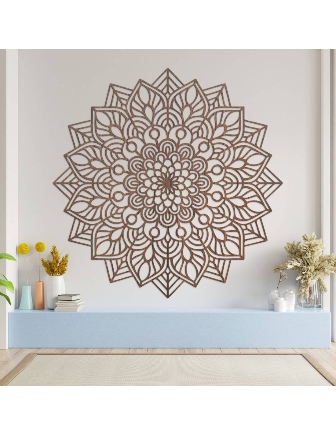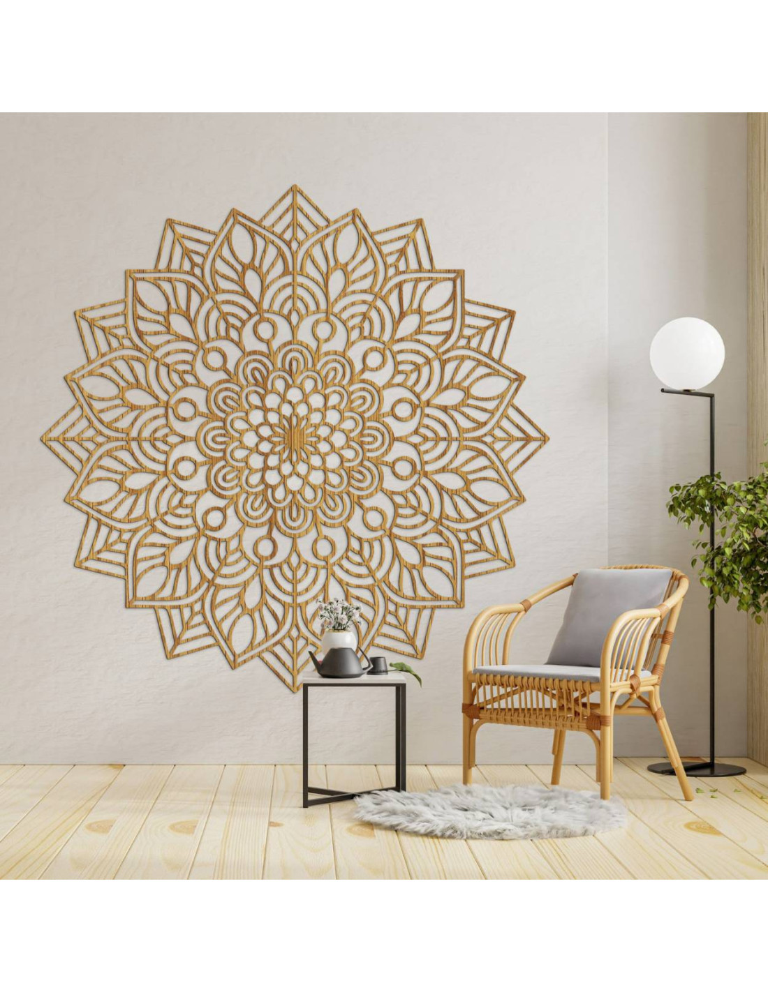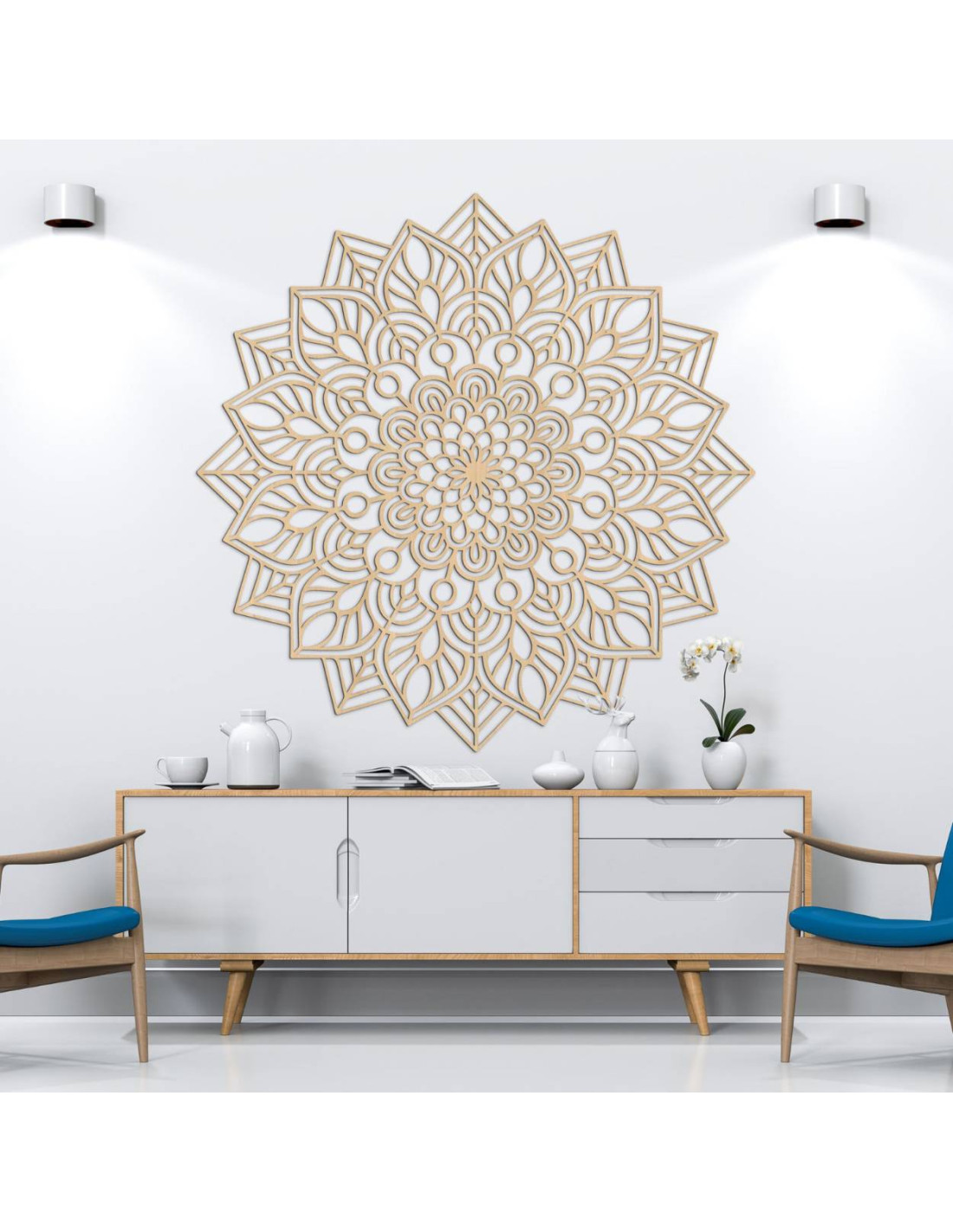 O mandală din lemn pe perete aduce eleganță, precizie și armonie interiorului.