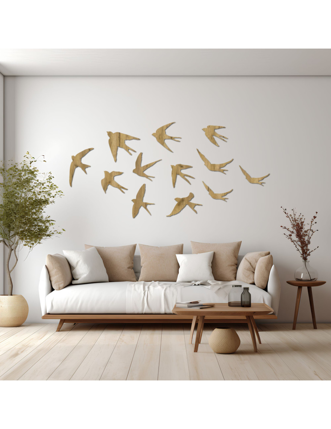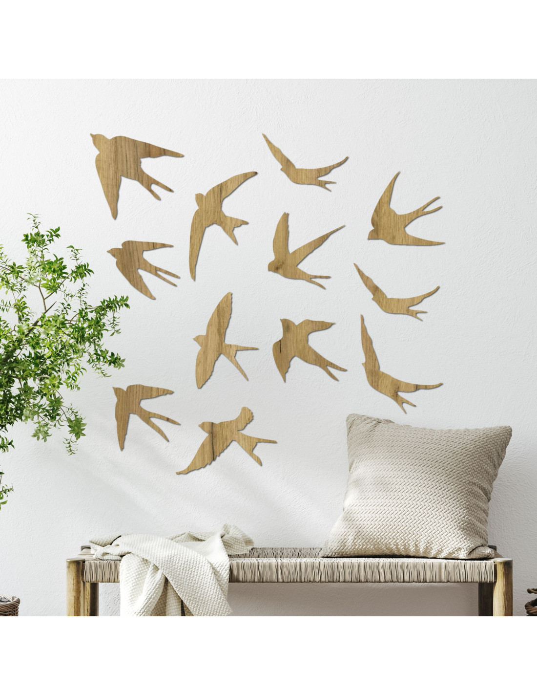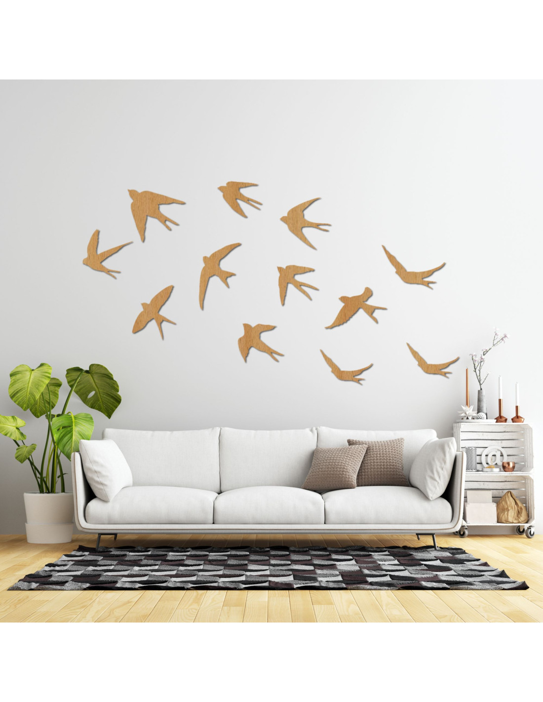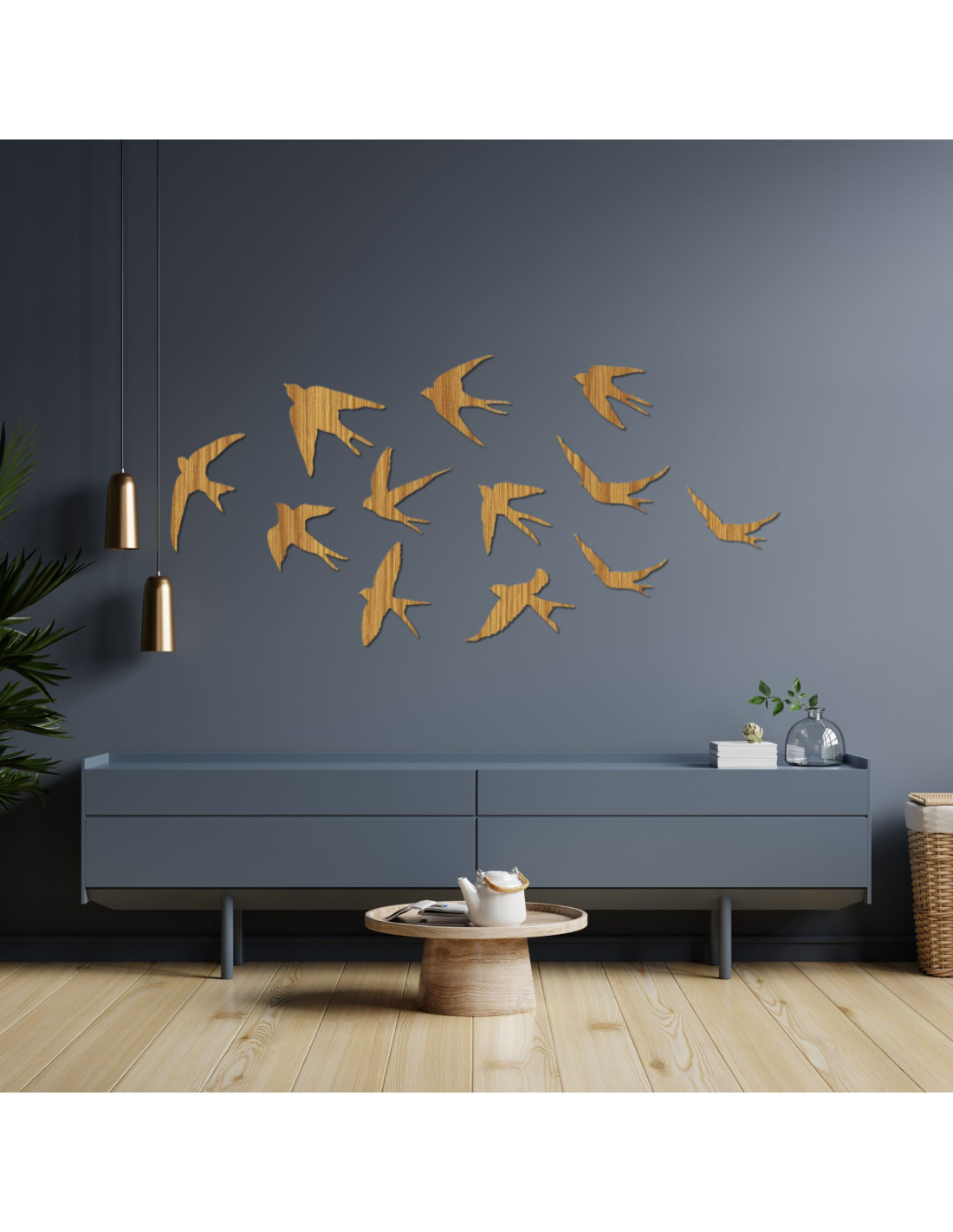 Decorațiune de perete - rândunele, păsări zburătoare din lemn , artă inspirată din natură (set de 12 piese)