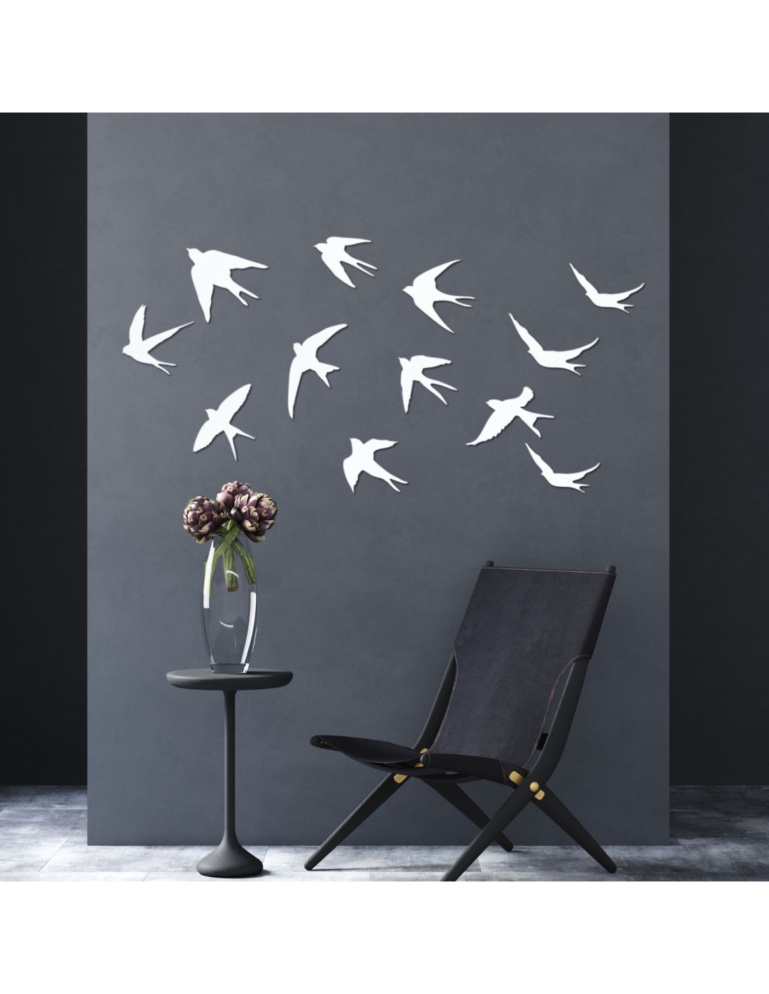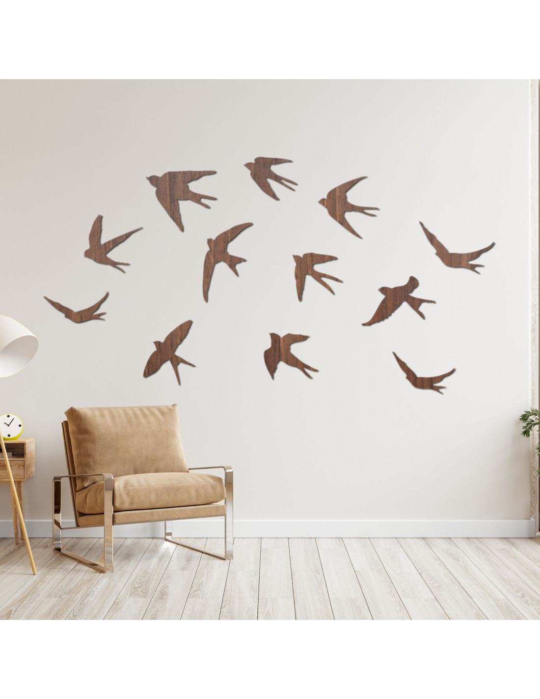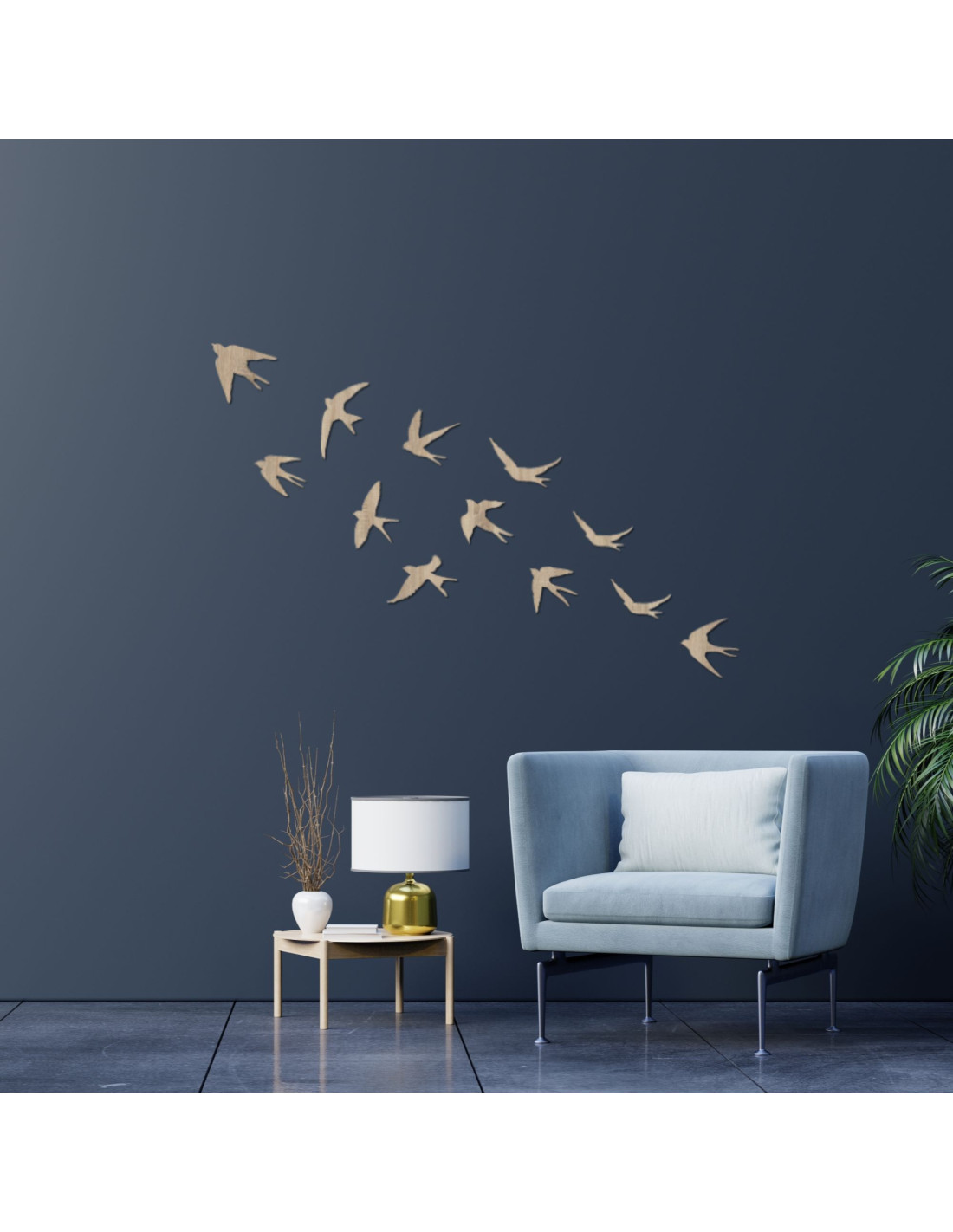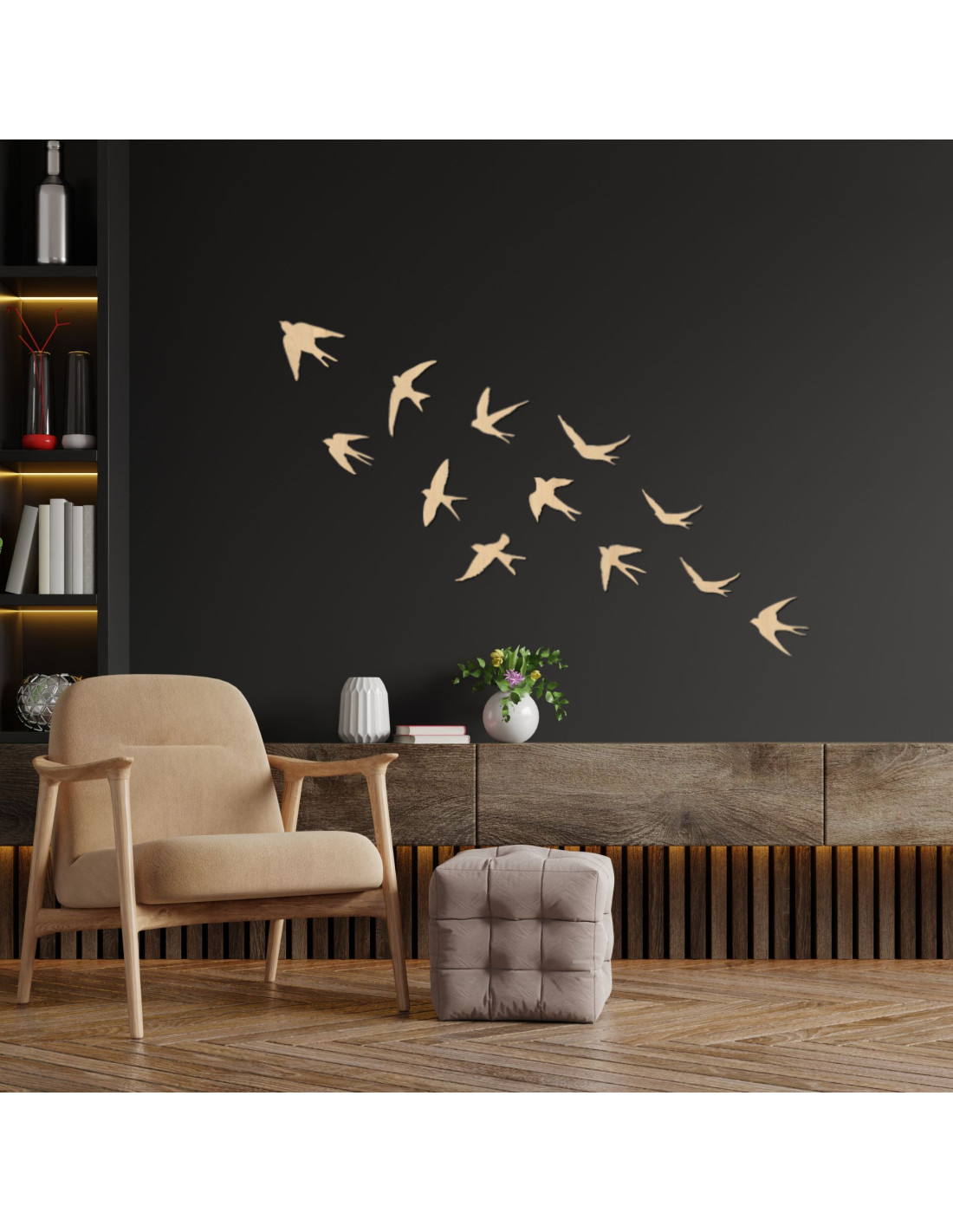 Decorațiune de perete - rândunele, păsări zburătoare din lemn , artă inspirată din natură (set de 12 piese)