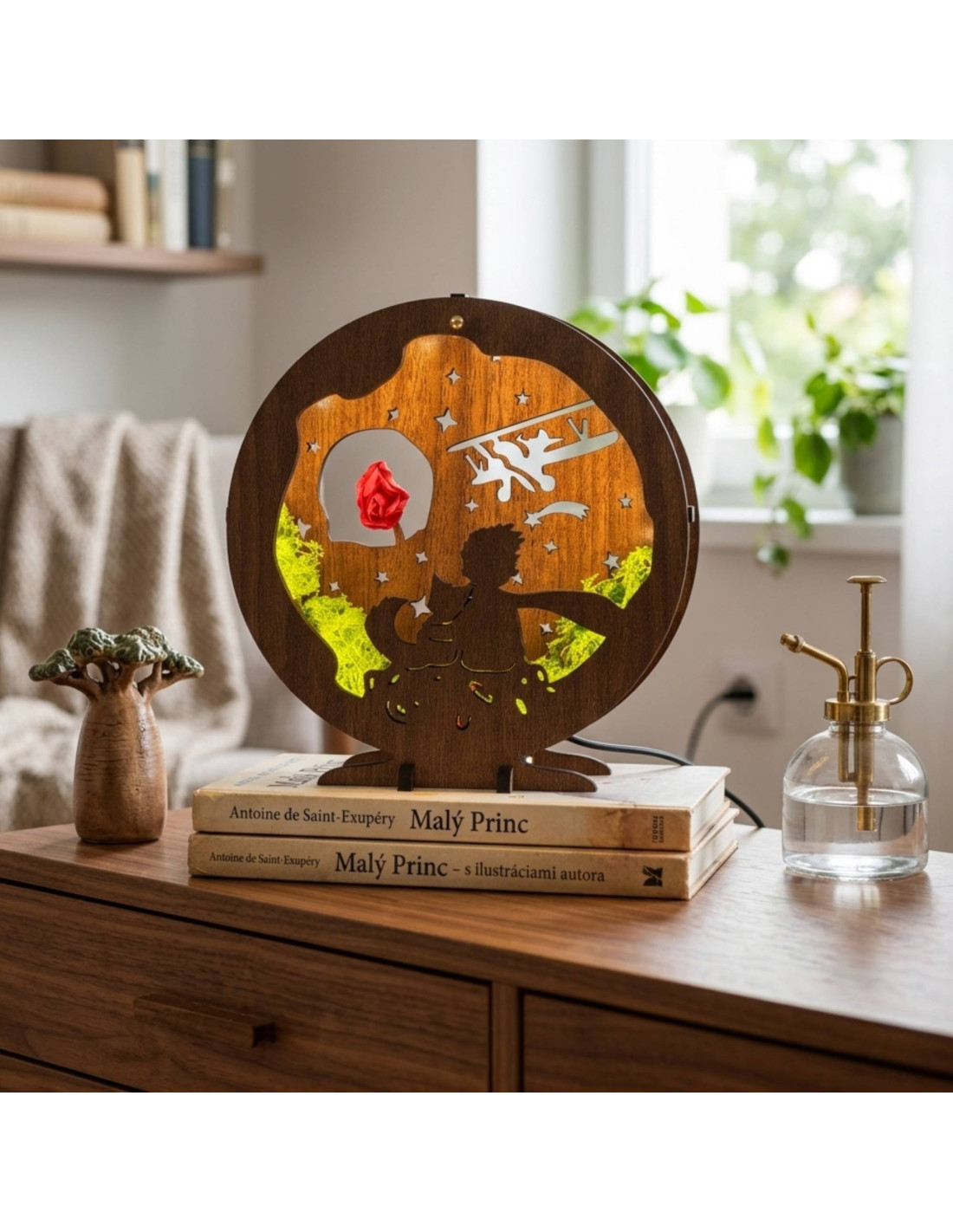 Designul detaliat cu figurina Micului Prinț, un trandafir și cerul nopții creează o lumină ambientală caldă și plăcută , ideală pentru sufragerie, dormitor sau camera copiilor.