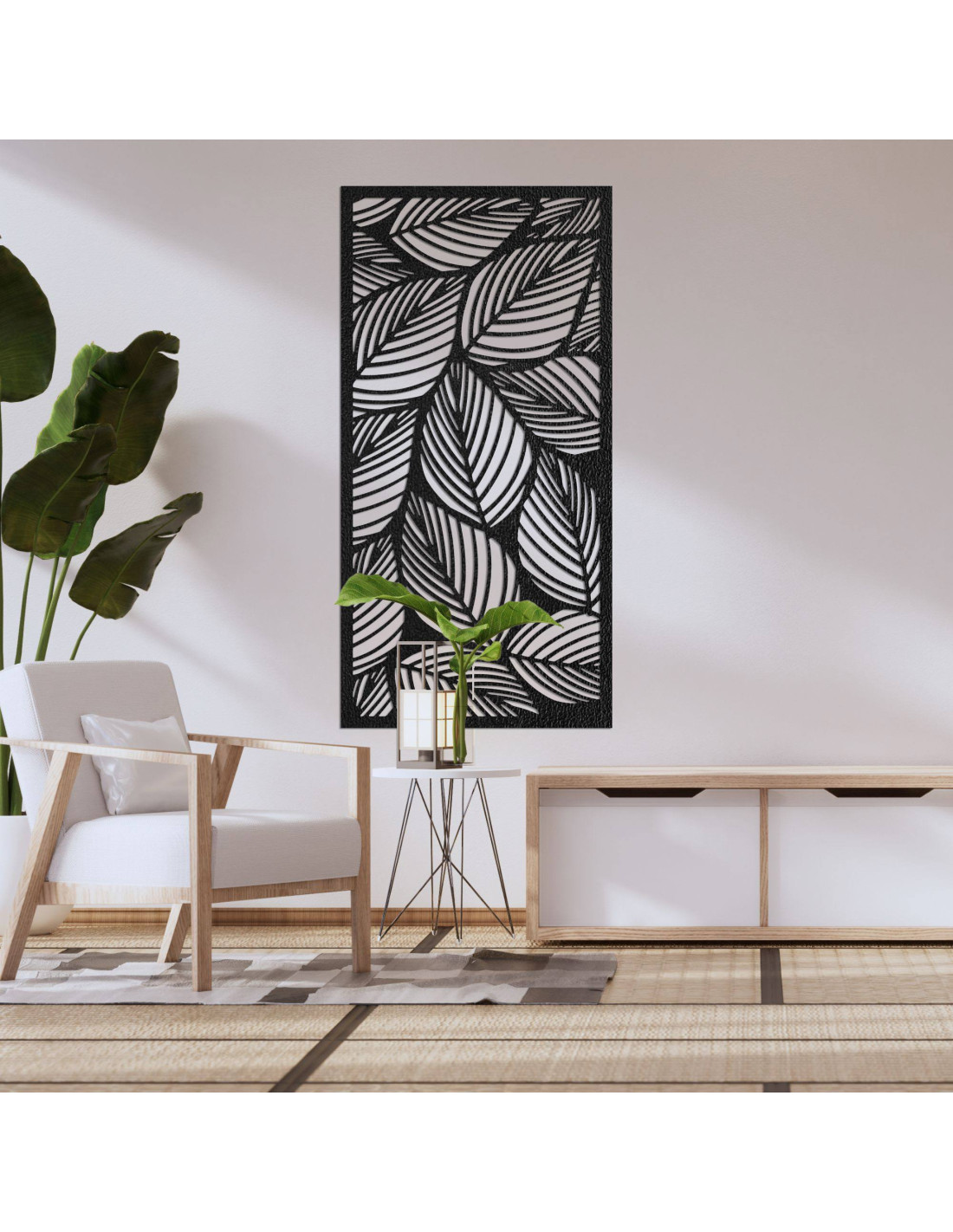 O pictură de design cu motiv de frunze aduce o notă de natură și ușurință în interior.