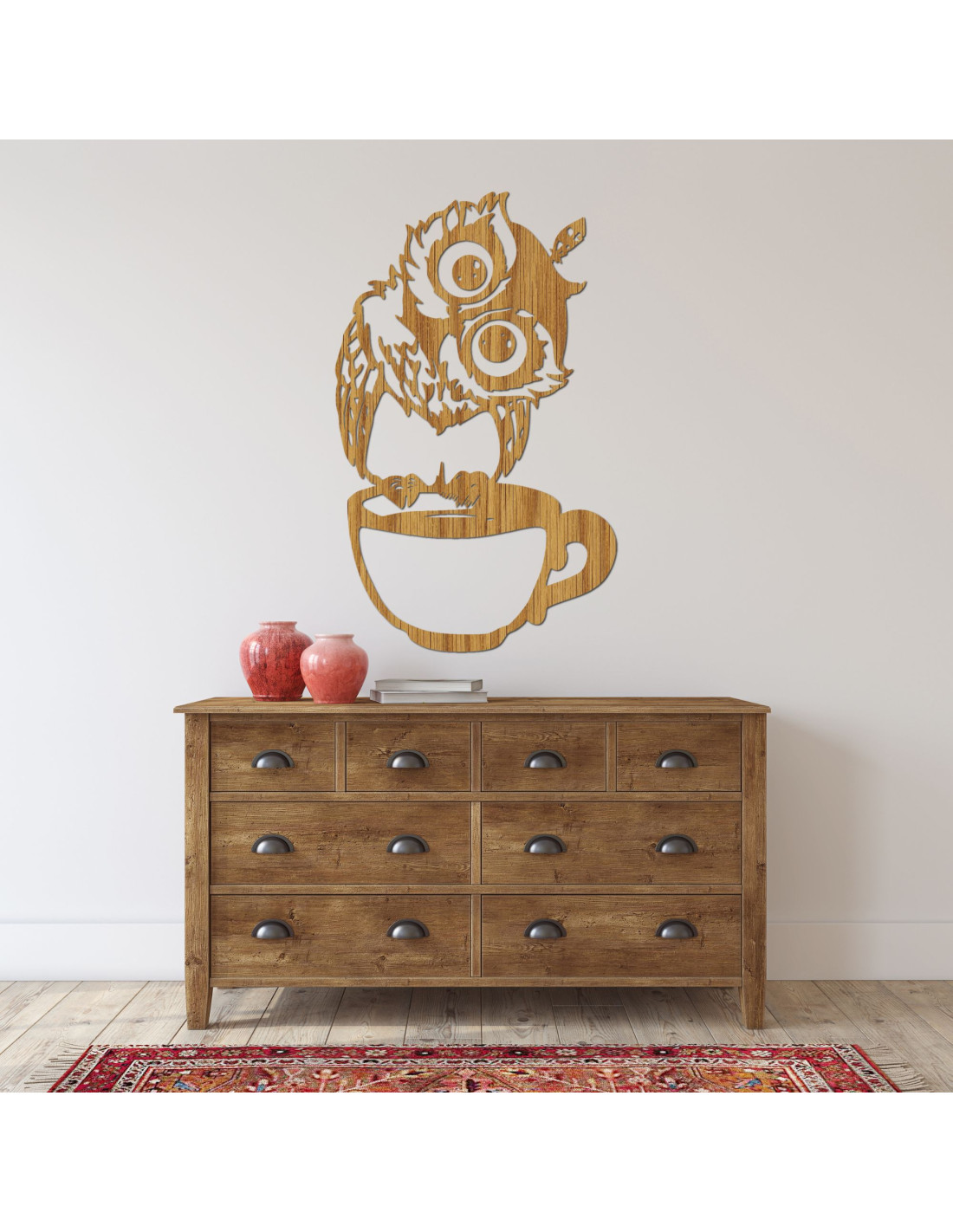 Pictură murală drăguță din lemn reprezentând o bufniță într-o cupă | Bufniță