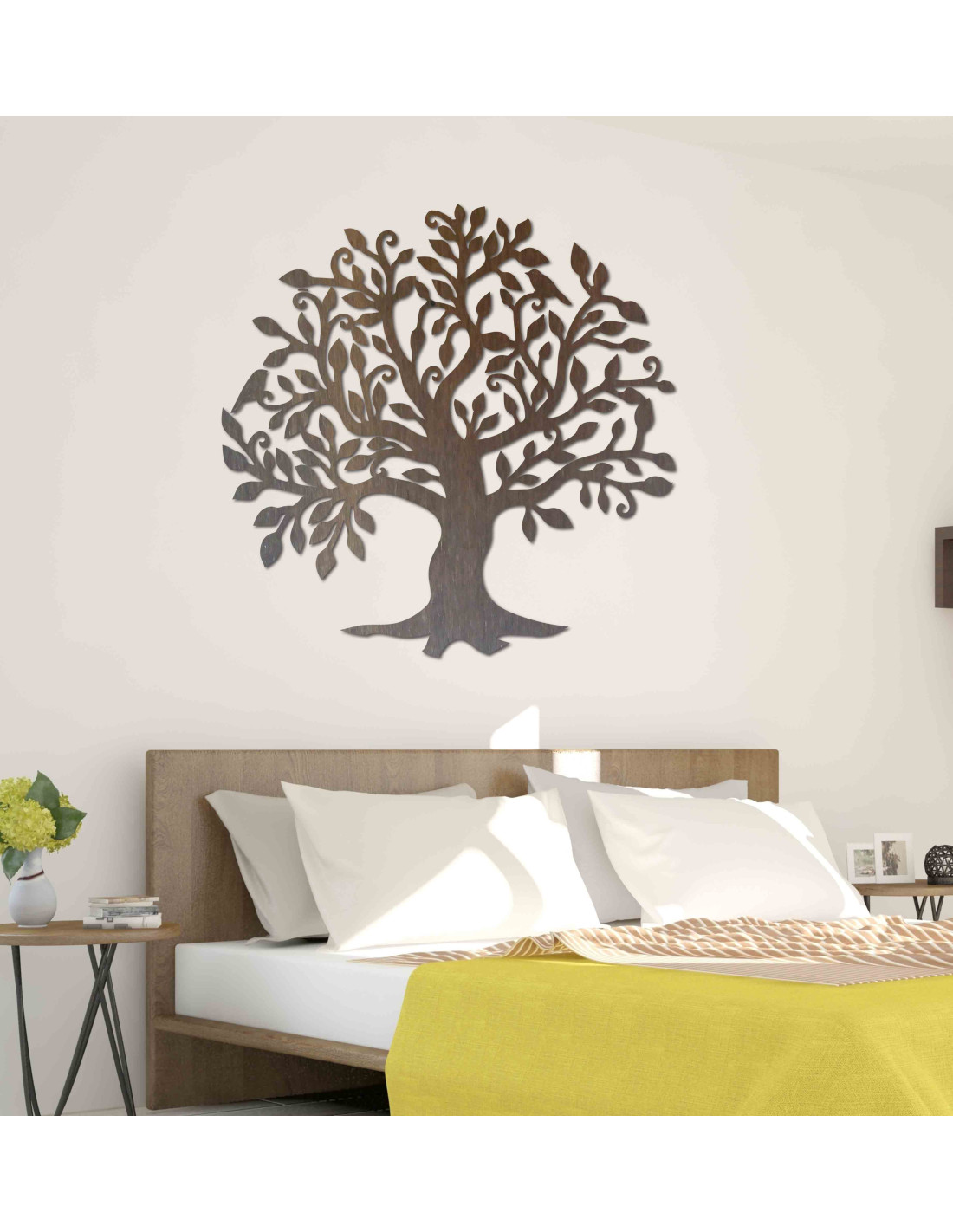 Decorațiunea de perete din lemn în formă de pom al vieții este un accesoriu stilat și elegant care va înviora orice interior.