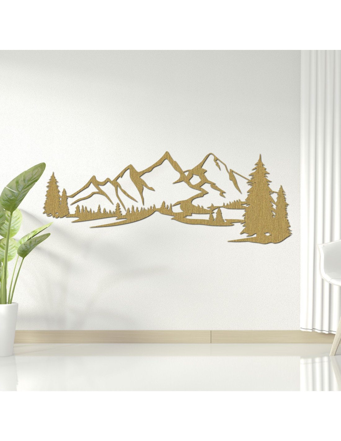 Acest peisaj montan cu conifere este creat prin tăiere cu laser pentru detalii precise și finisat cu atenție pentru a crea un efect vizual curat și distinctiv.