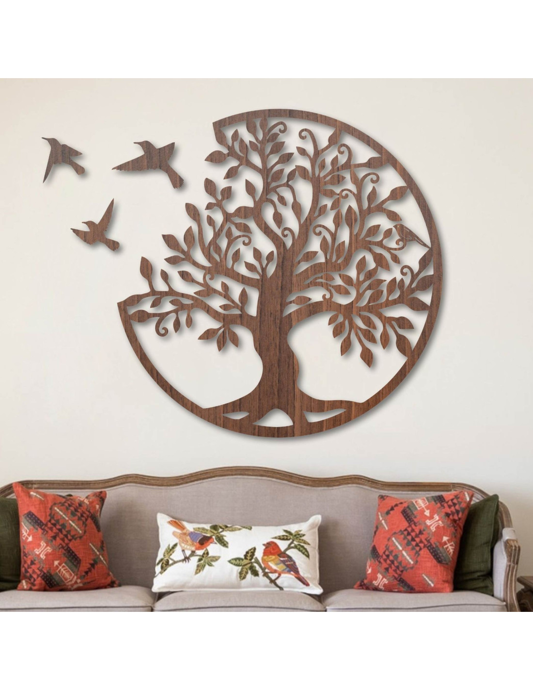Decorațiune elegantă de perete din lemn, în formă de pom al vieții cu păsări, care aduce armonie și frumusețe naturală casei tale. Această imagine unică din placaj este sculptată folosind tehnologie laser precisă și apoi finisată manual pentru un aspect perfect și un finisaj de înaltă calitate.