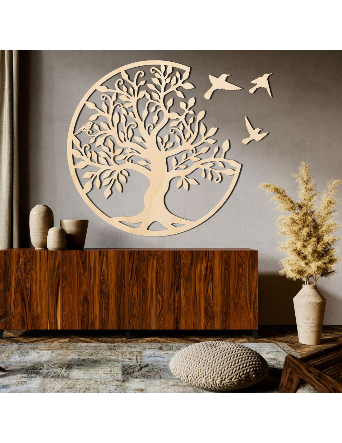 Pomul vieții din lemn cu trei păsări care zboară spre dreapta este o decorațiune elegantă de perete care va aduce stil și armonie interiorului tău.