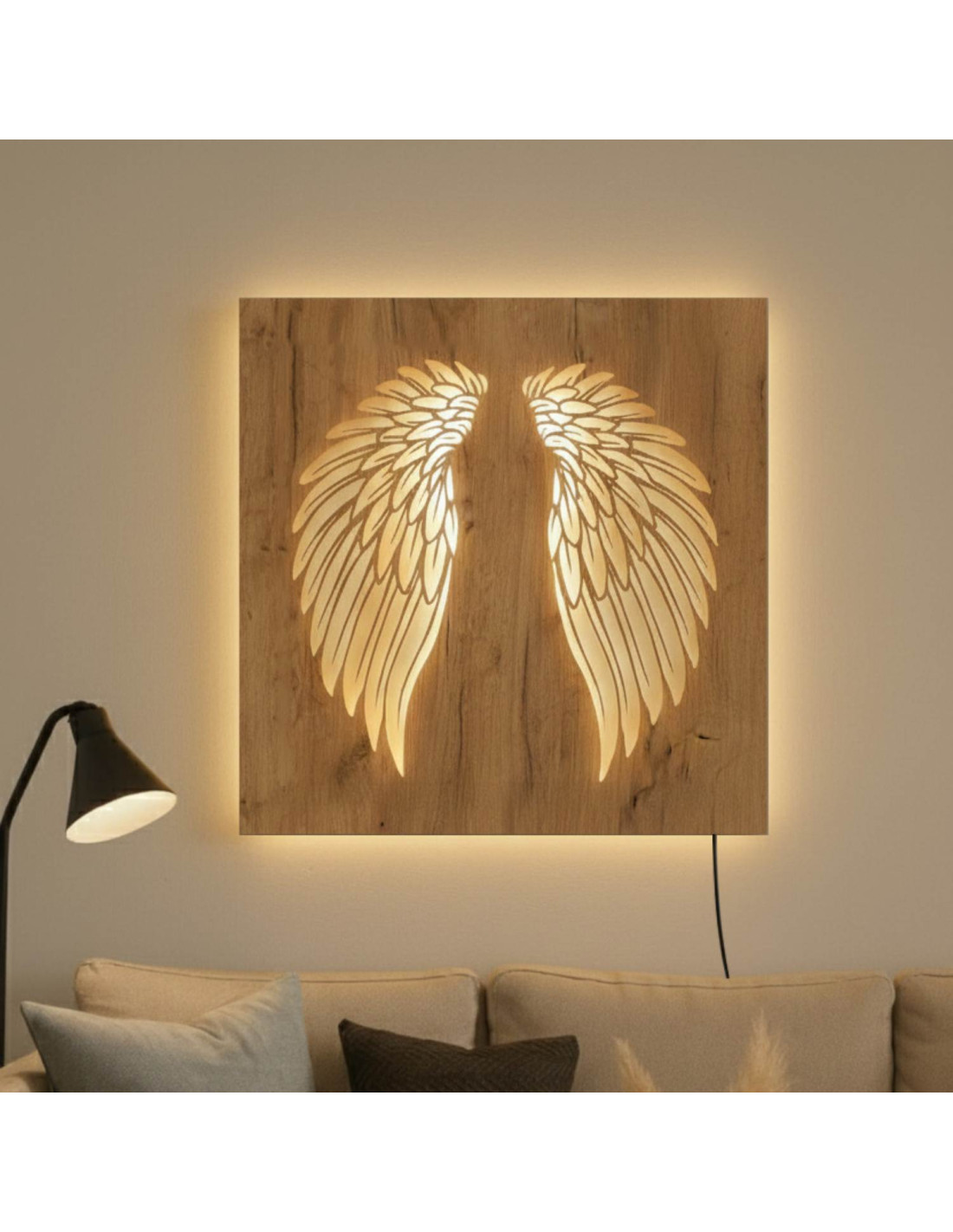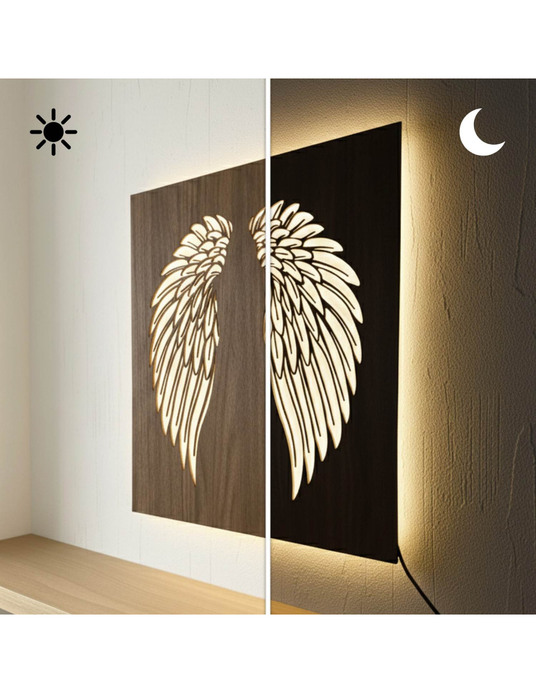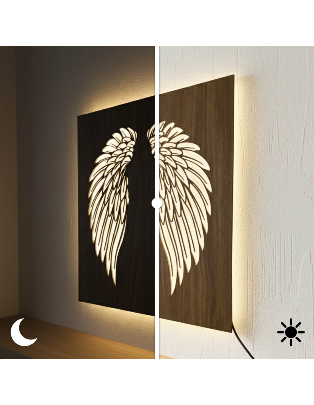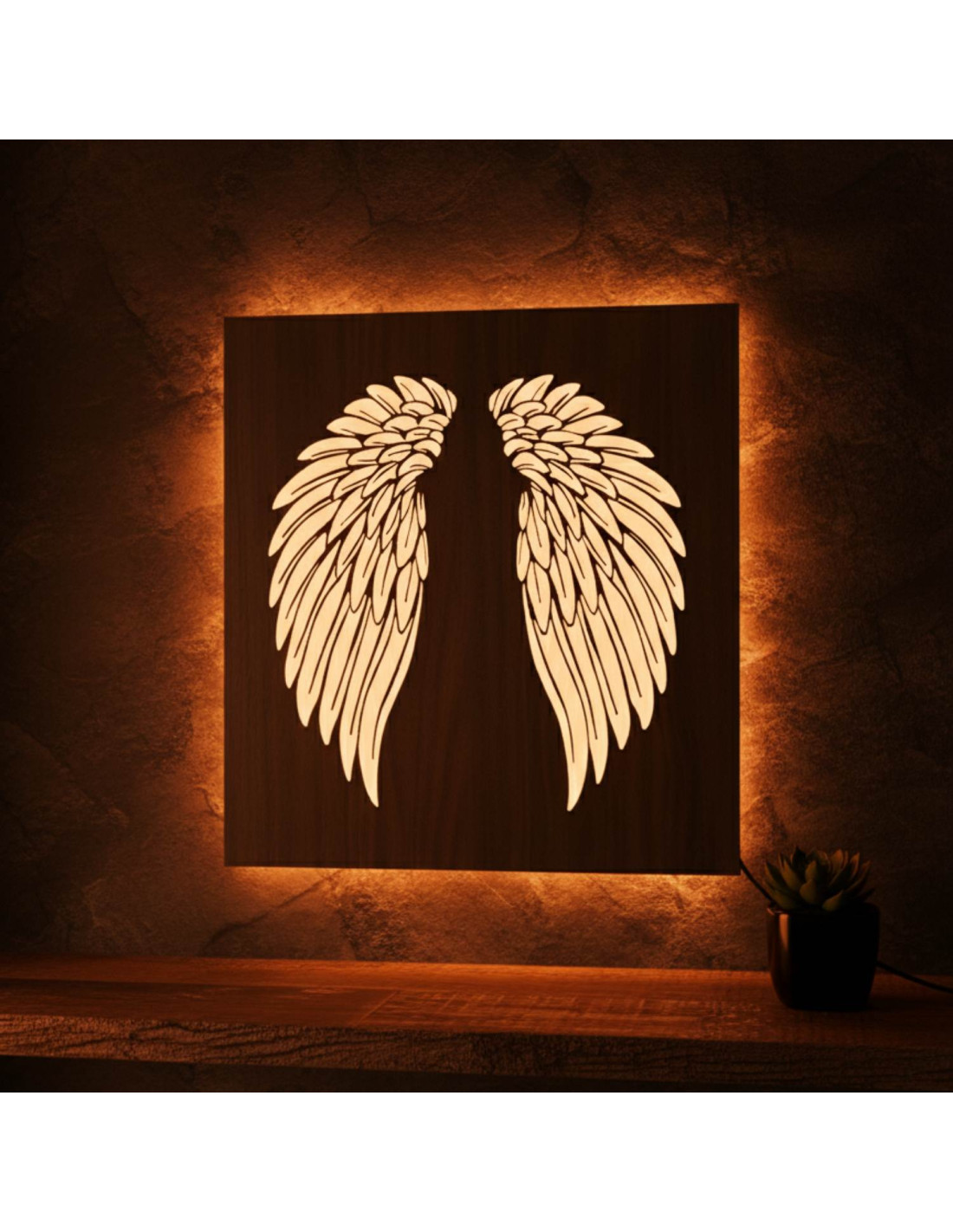 Tablou din lemn cu iluminare din spate cu LED - Aripi de înger pe perete - MULO