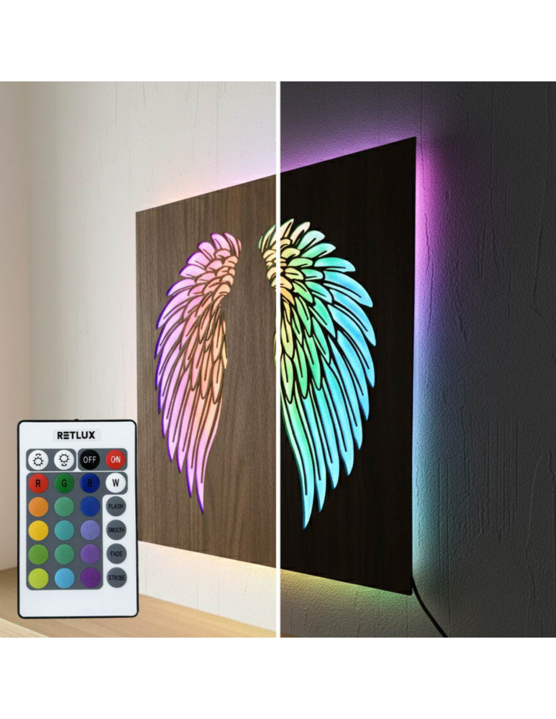 Tablou LED din lemn - aripi de înger cu iluminare RGB modernă