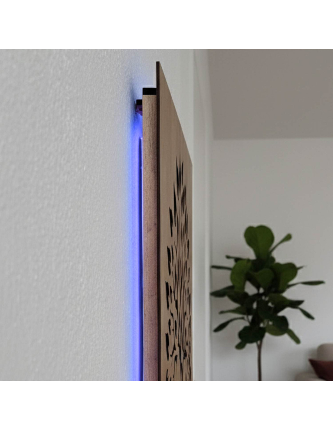 - Efect de lumină: Imaginea este, de asemenea, iluminată din spate din lateral, creând un efect ambiental mai pronunțat și un contur luminos elegant pe perete.